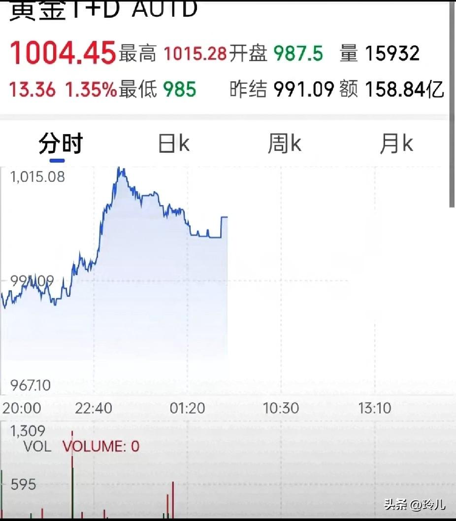 今天3月30日周一早6点, 黄金开盘直接给答案! 国内黄金T+D最新1004.45元/克, 今开987、最高1015、最低985,昨结991,开盘后直接拉涨,不是跌。周末外盘没大波动,今早国内直接跳涨站稳千元,凌晨1001元/克的小跌只是短暂回调。 别被短期波动带偏!普通人别碰期货杠杆,有闲钱就买银行投资金条,1020元/克左右,比金店首饰金划算太多,实物拿在手里才踏实。短期震荡不改长期保值逻辑,千元关口是很好的配置节点。 10点后我再更实时行情,你觉得今天金价能站稳1010吗?