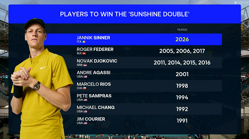 辛纳6-4/6-4击败莱赫卡,拿下了迈阿密大师赛冠军,成功解锁阳光双冠!历史上第八位达成此成就的球员
