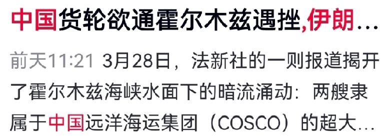 48小时光速翻脸!伊朗承诺成空,中国两艘巨轮被强行拦截折返 伊朗外长刚向全世界表态,霍尔木兹海峡对中俄等友好国家敞开通行,话音未落便上演现实版打脸。 3月27日凌晨,中远海运“中海印度洋”“中海北冰洋”两艘万吨巨轮,在拉拉克岛海域遭伊朗革命卫队强行拦截,船上中国船员与货物被迫原路返回。 一边是外交部的友好承诺,一边是武装力量的强硬封锁,两套指令截然相悖。所谓开放通行暗藏严苛报备门槛,船只目的地为阿联酋、沙特,即便中方船只也未能豁免。 中远海运早已识破套路,随即调整航线绕道通行。霍尔木兹海峡从来不是馈赠,而是伊朗的地缘筹码,这场闹剧,彻底撕下了虚伪承诺的面具。 对此,你怎么看? 伊朗外交翻脸 霍尔木兹海峡 中国巨轮被拦