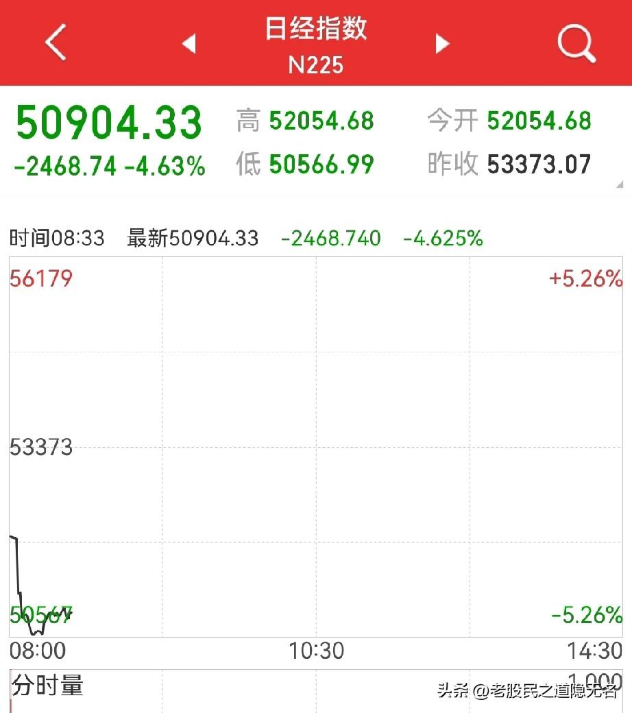 再次回踩会有多深? 日经早盘已经塌了,大A是稳住、新低还是正常回踩? 周末的“消息面”比较乱,但总体上不利于资本市场。 比如霍尔木兹海峡的封锁,油价再起,老美的地面部.队磨刀霍霍… 早盘的日经(下图)正在“验证”以上消息。 周一周二,考验大A的时间到了,是稳住还是正常回踩,甚至是新低? 本周初的走势,决定了四月的方向。