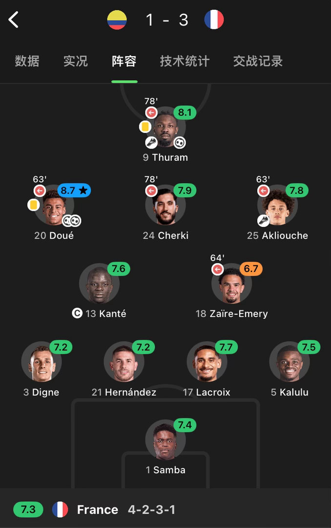 三天前,法国主力阵容2-1战胜巴西。今天凌晨,法国11个首发全轮换,60分钟就3