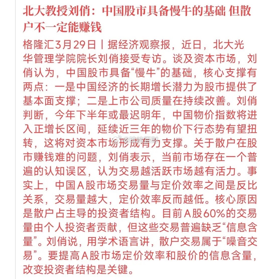 终于有教授说出了股市的实话,A股确实有慢牛北大教授表示:A股确实有慢牛的基础,但是散户不一定赚钱。慢牛:中国经济增长,叠加上上市公司质量的改变不赚钱:A股处于散户交易市场,不具备长线持股的能力。