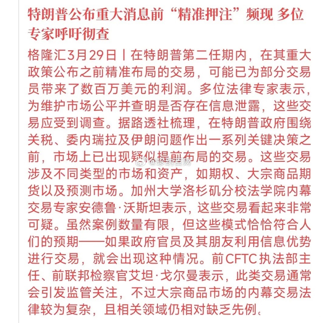 特朗普精准踩点,已经有人怀疑其操纵,要求调查了特朗普的操作有以下几点1.特朗普宣布暂停关税前4小时,有人大量买入SPY 509看涨期权(当天到期),直接获得收益达到2100% 。2.特朗普宣布与伊朗“富有成效对话”、暂停打击前15分钟,有人两分钟内成交约6200手布伦特和WTI原油期货原油,价值在5.8亿美元左右3.宣布对等关税前有人买入50万美元国债4.宣布暂停关税前有人卖出5–10万美元美债
