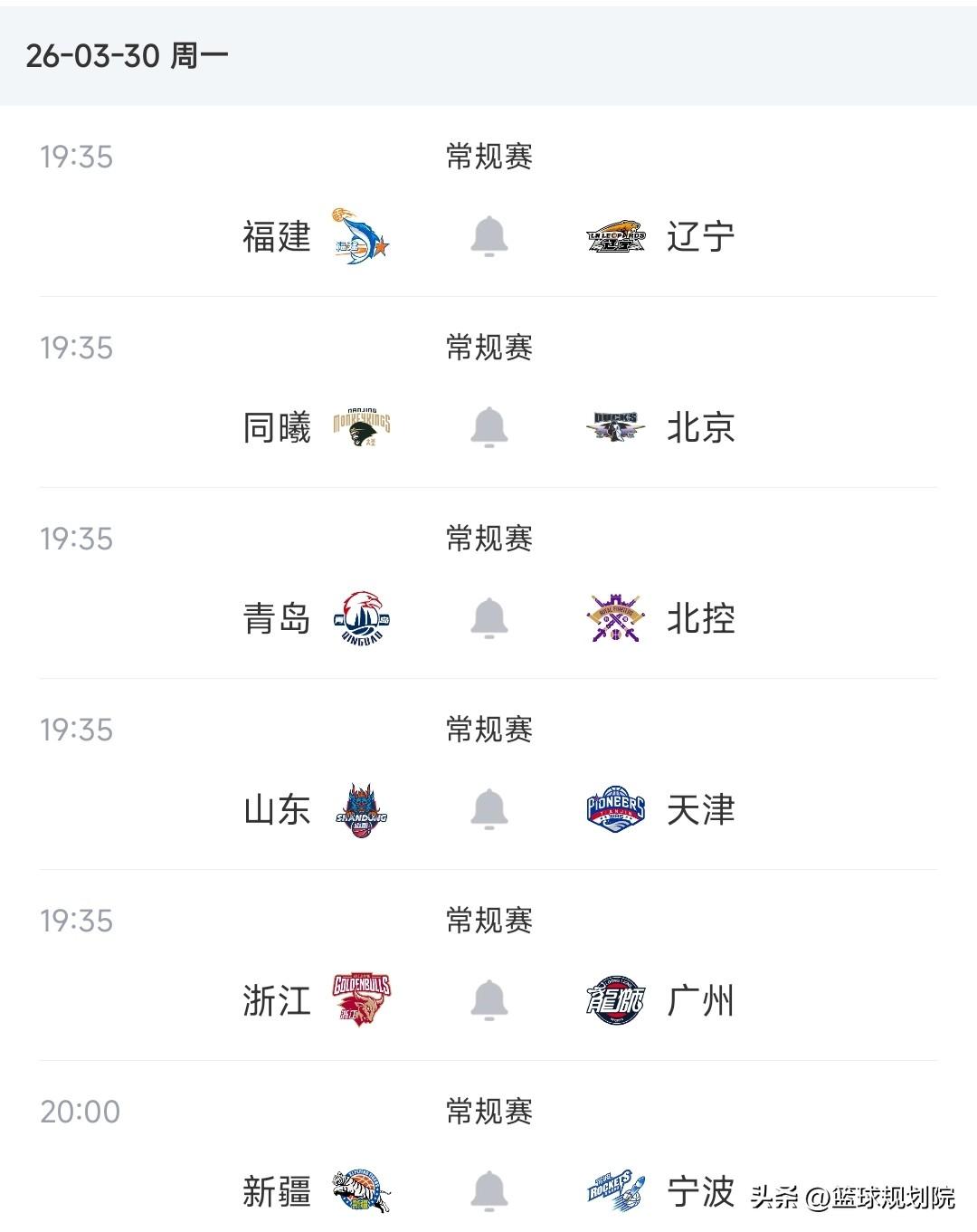 辽宁北北京出战!CBA今日赛程安排! 根据最新赛程安排,今日即3月30日共有6场比赛安排,分别为: 第一场,福建对阵辽宁 第二场,同曦对阵北京 第三场,青岛对阵北控 第四场,山东对阵天津 第五场,浙江对阵广州 第六场,新疆对阵宁波 今天这些比赛都很重要,为什么这么说! 辽宁要季后赛席位,北京要冲击四强席位,青岛、北控等等都是。 推荐比赛,福建对阵辽宁、同曦对阵北京 辽宁男篮目前客场两连败,而且球队状态糟糕,这场对阵福建,需要全队站出来并且消除负面影响! 同曦对阵北京,对于北京来说非常重要是进入四强的卡位战!