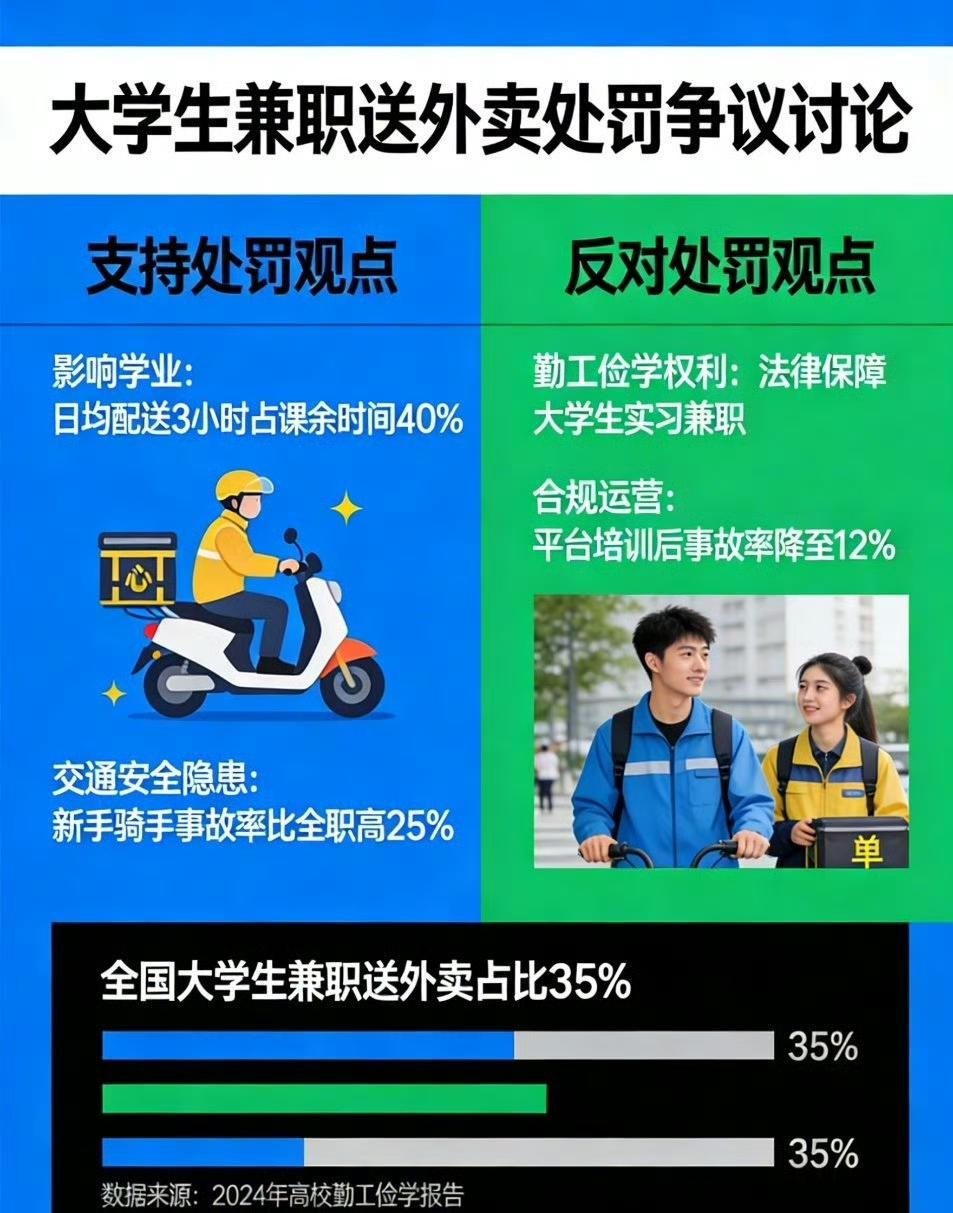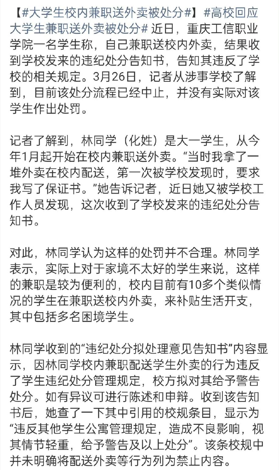 重庆工信职业学院这事儿挺让人无语的。大一学生林同学从1月起在校内兼职送外卖补贴生活,第一次被发现写了保证书,再被发现就收到违纪处分告知书。可校规里“违反其他学生公寓管理规定”,根本没明确说送外卖不行。 校内有10多个学生,包括贫困生都靠这兼职过日子。律师也说了,学生有勤工助学的权利,学校不能用这种概括性条款限制劳动权。好在学校工作人员回应已中止处分流程,没实际处罚,不然真就寒了学生的心。希望学校以后制定规则能更明确合理,别让学生兼职这么难。 对于林同学这样的大一学生来说,利用课余时间送外卖补贴生活,体现了他的独立和担当。在如今物价不断上涨的情况下,学生的生活成本也在增加,很多像林同学这样的学生,尤其是贫困生,只能通过兼职来缓解经济压力。他们渴望用自己的双手创造更好的生活,而学校本应是他们实现梦想的助力者,而非绊脚石。 学校工作人员中止处分流程,这是一个积极的信号,说明学校愿意倾听学生的声音,及时纠正可能存在的错误。但这只是一个开始,学校更应该以此为契机,对校规进行全面梳理。在制定规则时,要充分考虑学生的实际需求和权益,让规则既符合校园管理的要求,又能为学生的成长提供便利。 希望重庆工信职业学院能从这次事件中吸取教训,在未来的管理中更加人性化、科学化,为学生创造一个既有序又充满活力的校园环境,让学生能够安心学习,开心兼职,健康成长。 大学生干外卖 送外卖大学 外卖员拒赔 重庆理工事件 送外卖女大学生 学生兼职维权 重庆工信职业 湖南理工外卖 重庆大学城外卖 重庆学生工 无证送餐 高校送餐员 非法送外卖 理工大学外卖 兼职开除 重庆体育外卖 来源:微博智搜