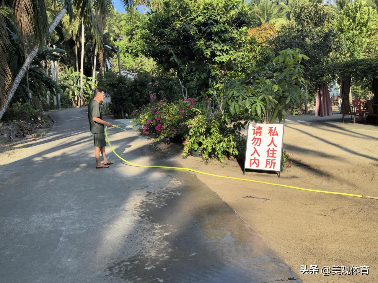 文昌文城镇某村与航天椰林湾酒店和住户以候鸟人群为主的航天椰林湾小区紧邻。村民在门口立了“私人住所 请勿入内”的告示。
