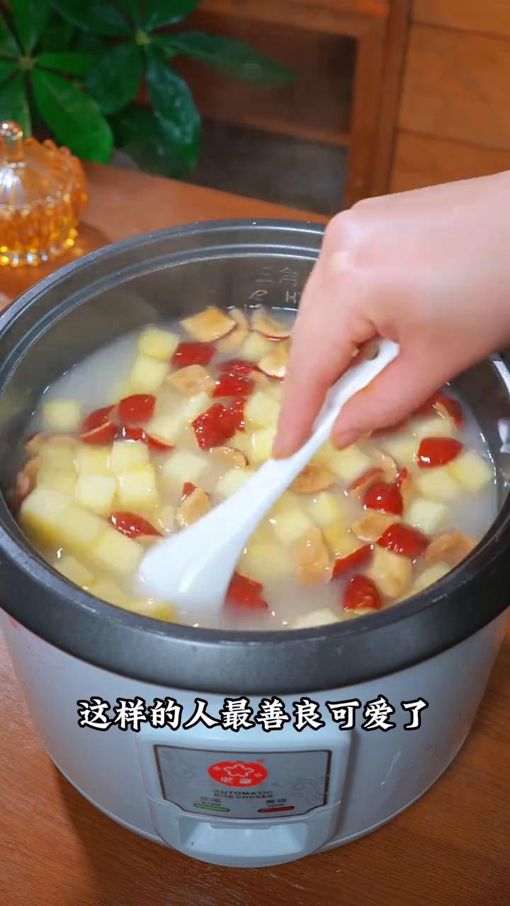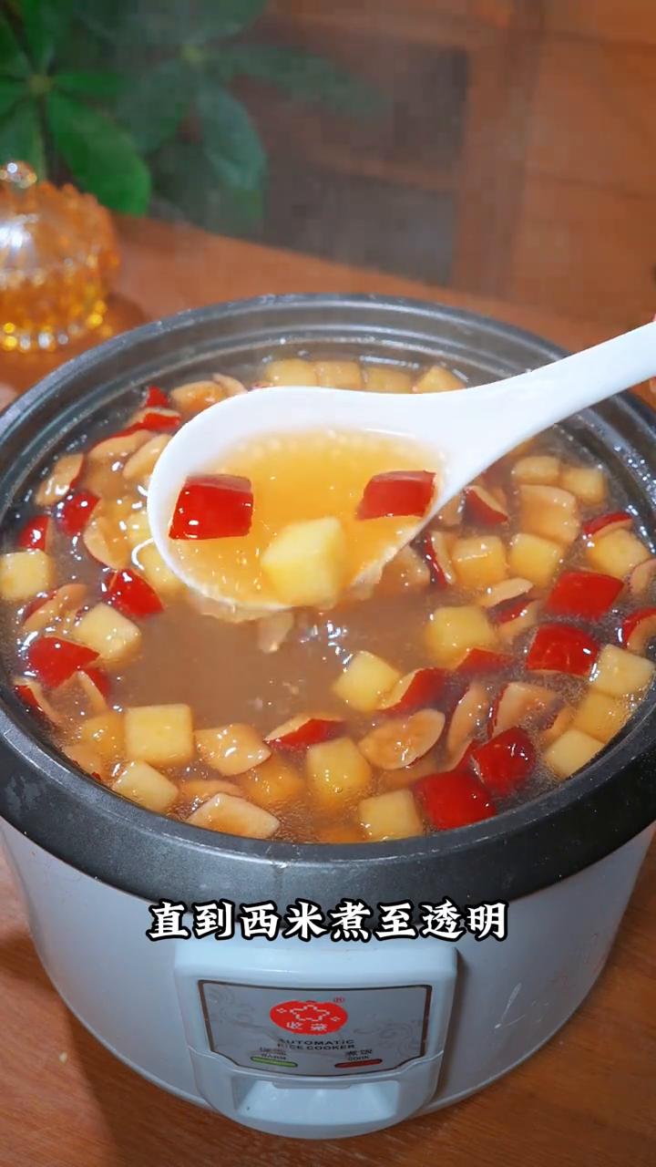 苹果西米露。 这是对皮肤很友好的搭配,尤其春天又冷又干燥,连喝两周素颜出门也漂亮。 ·首先把去皮的苹果切块,然后放入锅中,再放入几颗红枣、一包白西米。西米我一直用的他家的,配料表非常干净,给家人吃着也放心。 ·一定要加入101度的开水,要不然西米会融化掉。然后给它搅拌均匀,避免粘锅糊底。 ·扣盖大火煮20分钟,再焖5分钟,直到西米煮至透明。 ·再放入38粒枸杞,开火搅拌2分钟就可以出锅了。 这样做的苹果西米露营养价值高,西米q弹又软糯,老人小孩都爱喝。 喜欢你就赶紧收藏做起来吧!