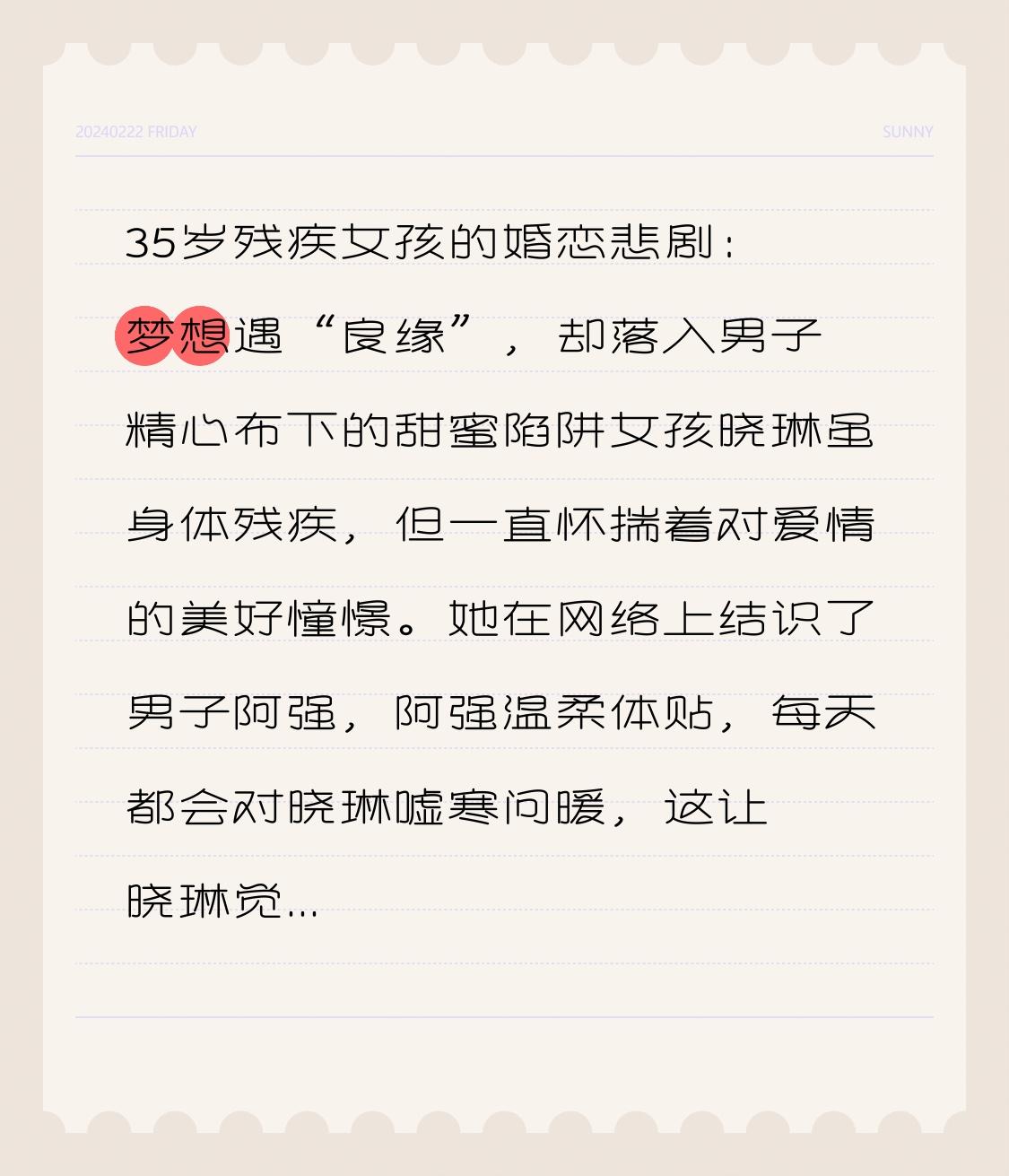 35岁残疾女孩的婚恋悲剧:梦想遇“良缘”,却落入男子精心布下的甜蜜陷阱女孩晓琳虽