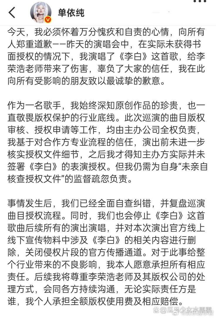 单依纯发长文回应单依纯向李荣浩再次道歉,称自己需为自身“未亲自核查授权文件”的监督疏忽负责,个人愿意承担全额版权使用费及相应赔偿。