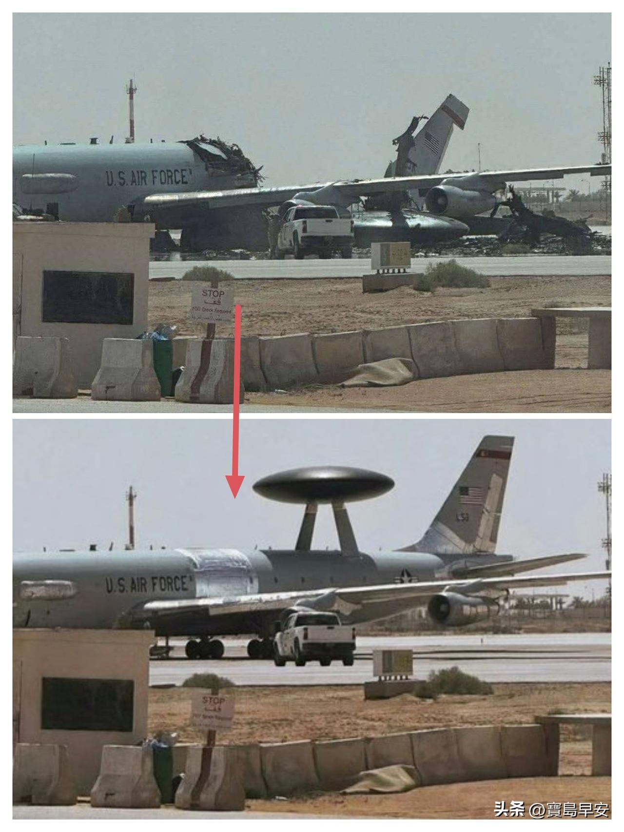 美军修复E-3 预警机 不得不说,美军的临时应变能力全球无人能匹配,E-3 预警机被伊朗无人机轰炸仅一个晚上,美军就连夜用胶水把它修复了,估计是不能再飞了,摆着看看还是可以的。怪不得五角大楼发出的声明强调E-3只是受损,并不是遭到摧毁。[抠鼻]