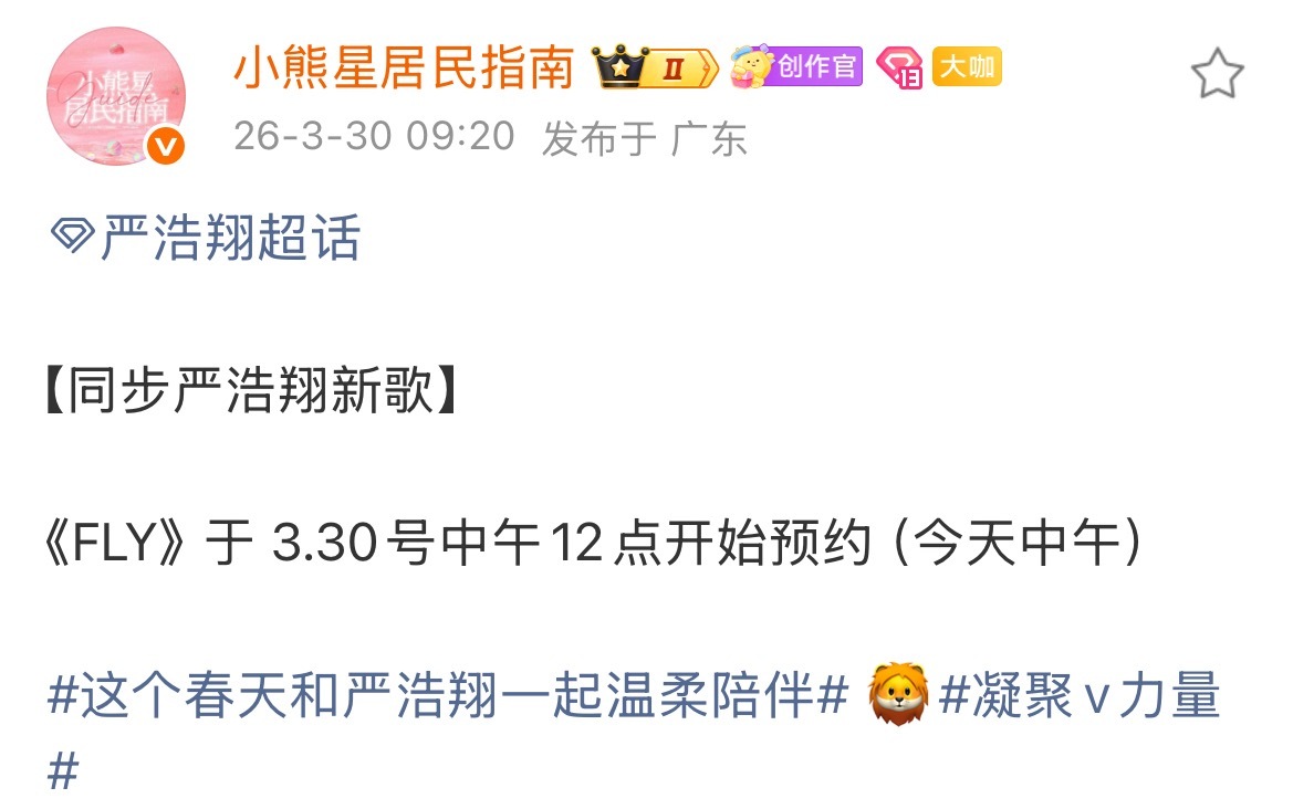 严浩翔新歌FLY预约 严浩翔新歌《FLY》预约预约时间:今天中午12点开始预约🔛4月1日零点上线,期待住了严浩翔 聊天记录