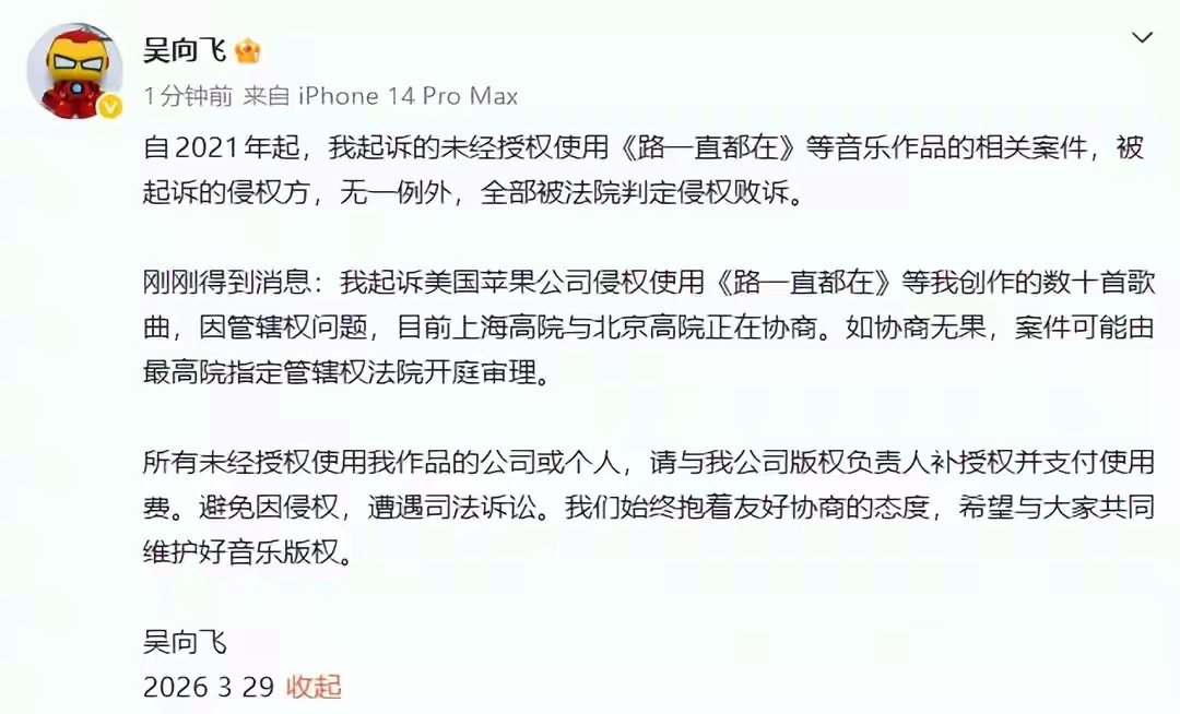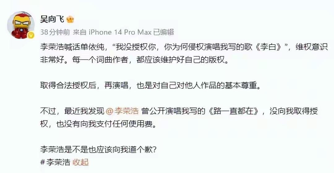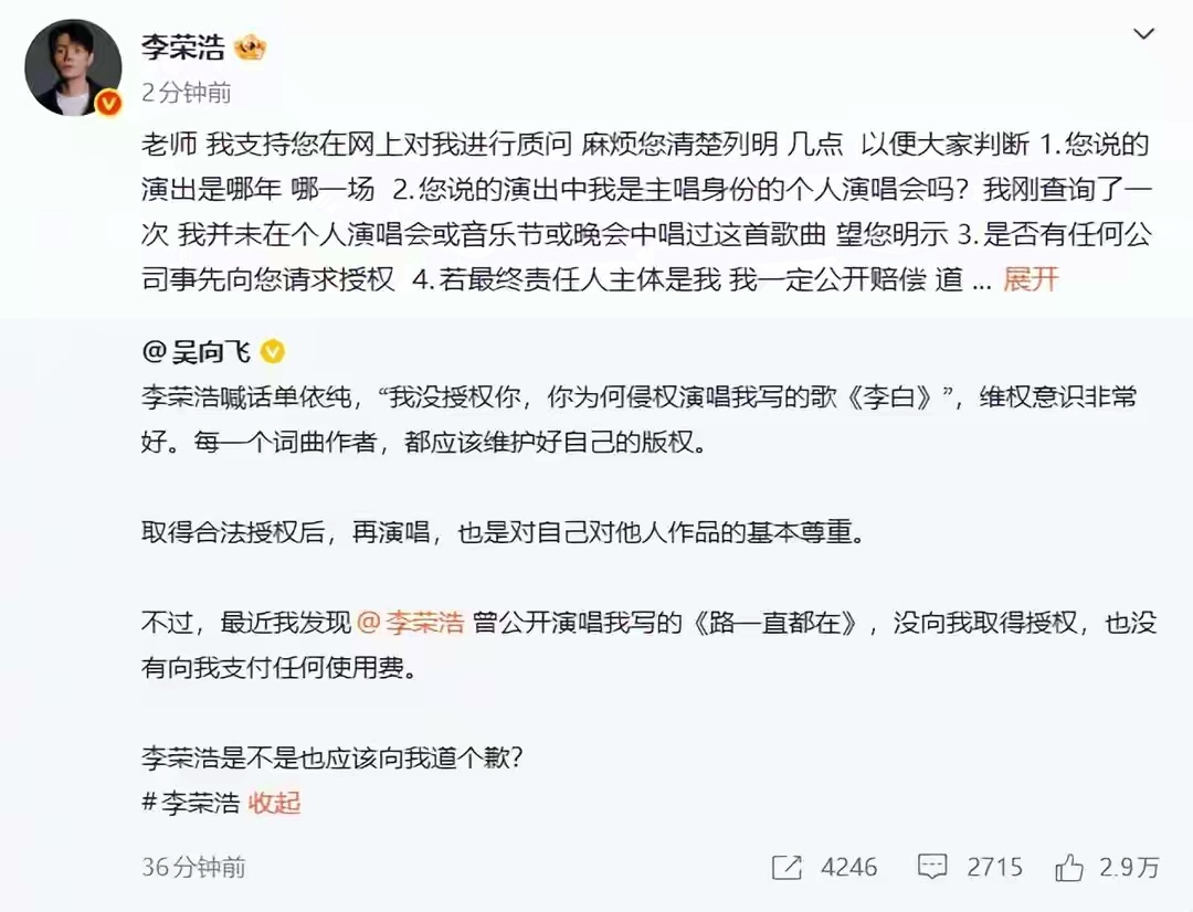 29日下午,歌手吴向飞连发两条微博质问李荣浩,“最近我发现李荣浩曾公开演唱我写的《路一直都在》,没向我取得授权,也没有向我支付任何使用费。李荣浩是不是也应该向我道个歉?”“所有未经授权使用我作品的公司或个人,请与我公司版权负责人补授权并支付使用费。”