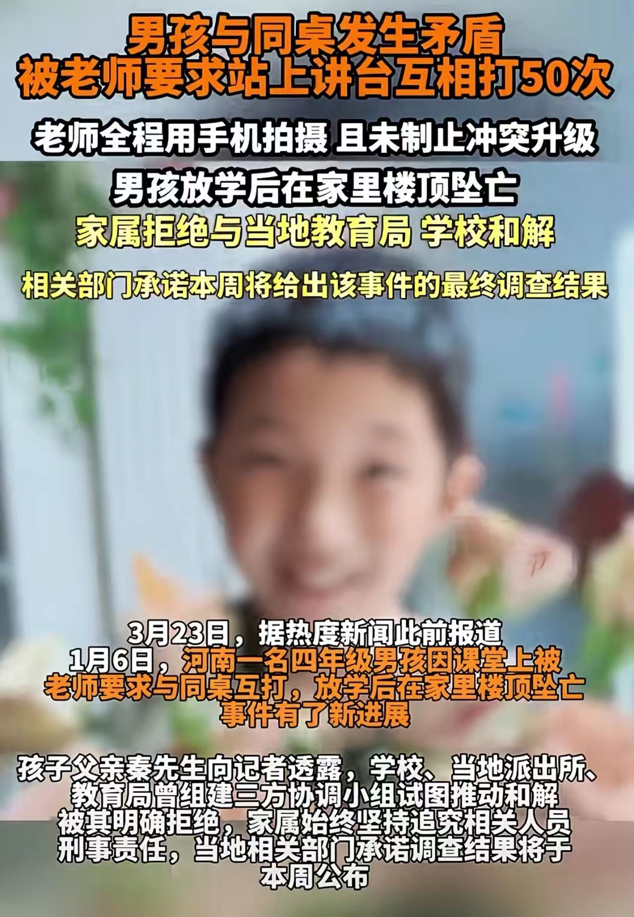 “太气人了!”河南郑州,10岁男孩和同桌发生矛盾,老师竟然让两人站在讲台上当众互打50次。男孩打输了,放学后想不开跳楼身亡。目前涉事老师仍在学校正常上课!孩子父亲:“我不要赔偿!老师让矛盾升级,是他害死了我的孩子!让他付出代价!”