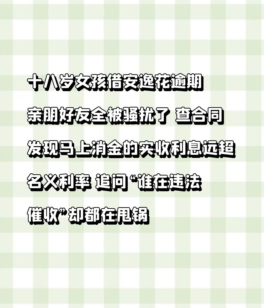 十八岁女孩借安逸花逾期亲朋好友全被骚扰了 查合同发现马上消金的实收利息远超名义利率 追问“谁在违法催收”却都在甩锅