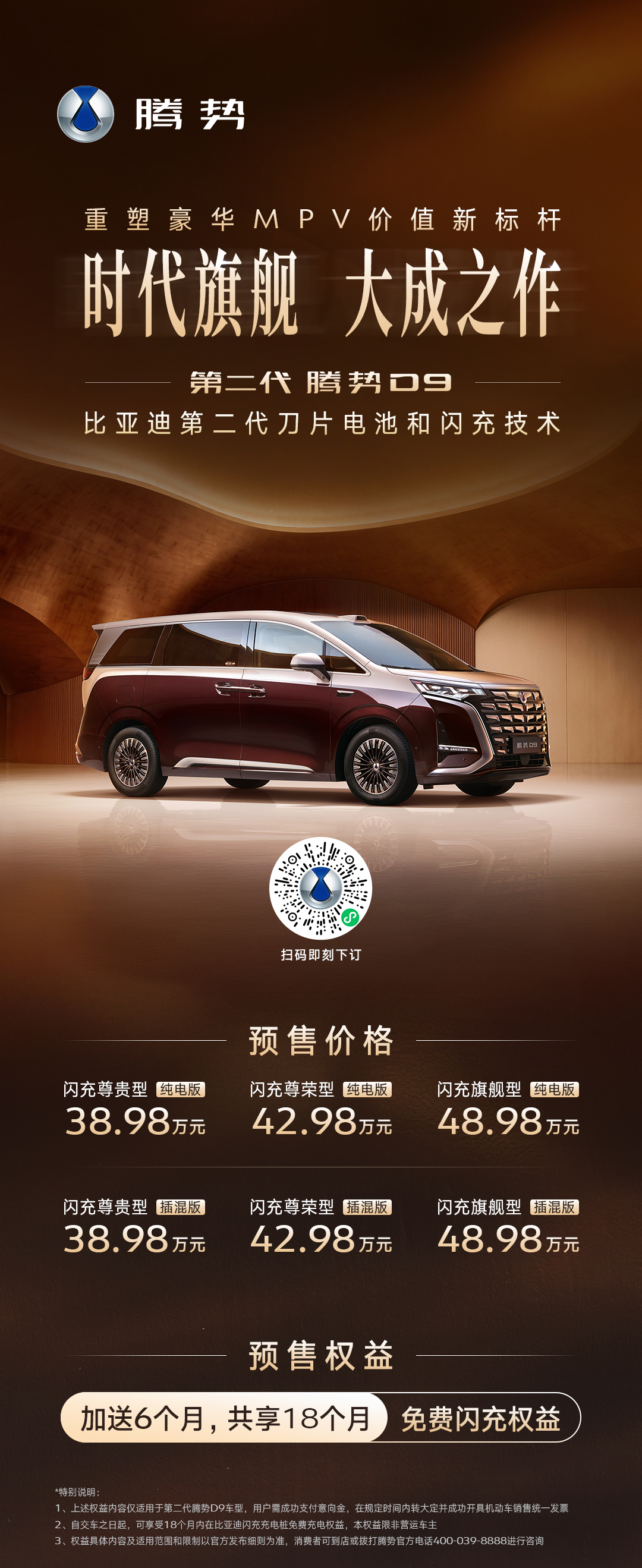 第二代腾势D9开始预售了,38.98万-48.98万,产品力直接拉满——第二代刀片电池上车,插混纯电续航能干到401km,纯电版更是800km起步,关键是5分钟充好、9分钟充饱,买杯咖啡的时间直接满电,这才是真正的零焦虑。