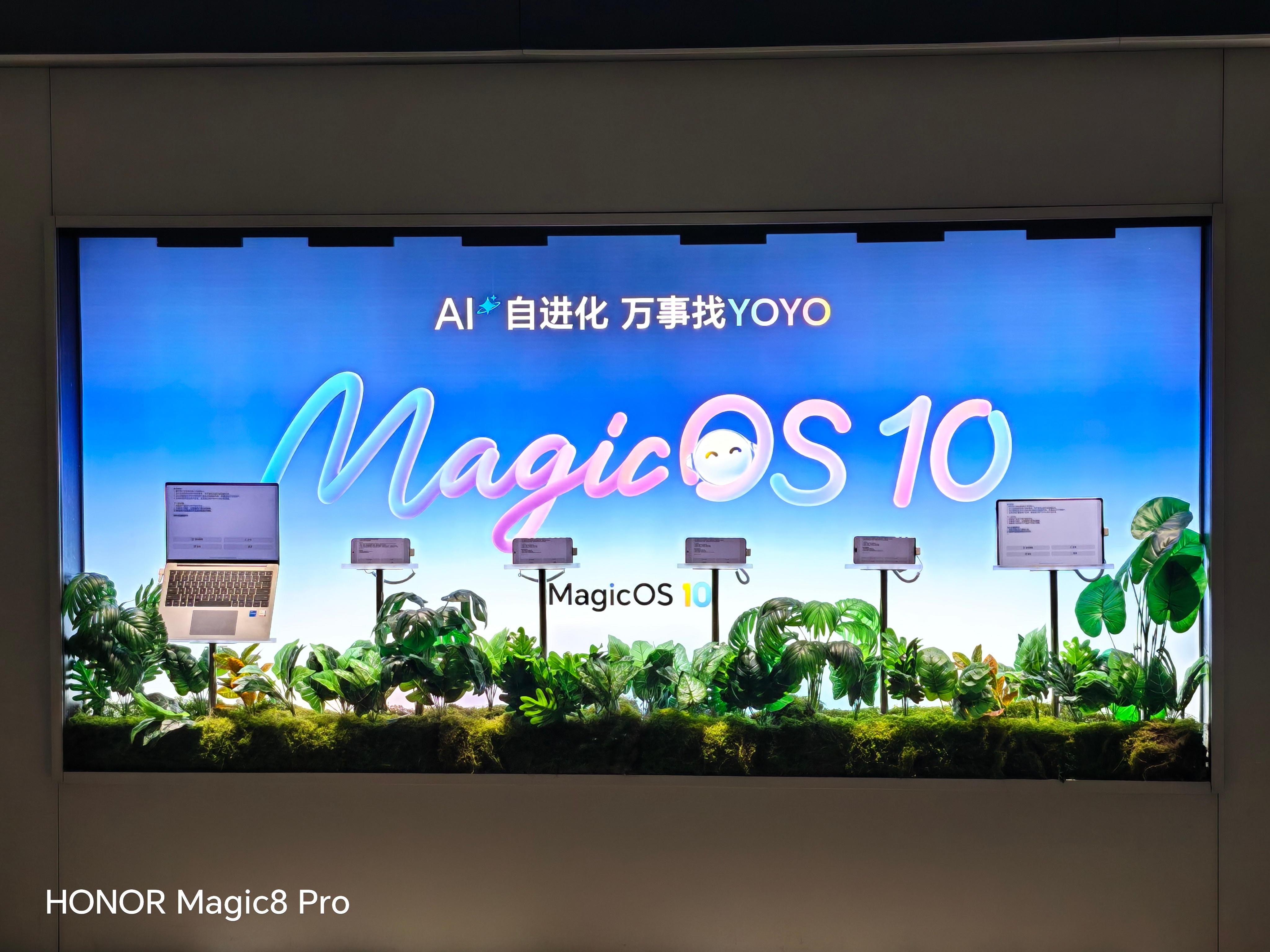 深圳机场的荣耀店铺,外立面陈列蛮有意思的,内嵌展示柜强调荣耀的多端协同能力,正门处就是当下主打的各系列新手机,中间那个风扇其实是个灯,转动起来就是 YOYO,可以给路过的人留下一些印象。
