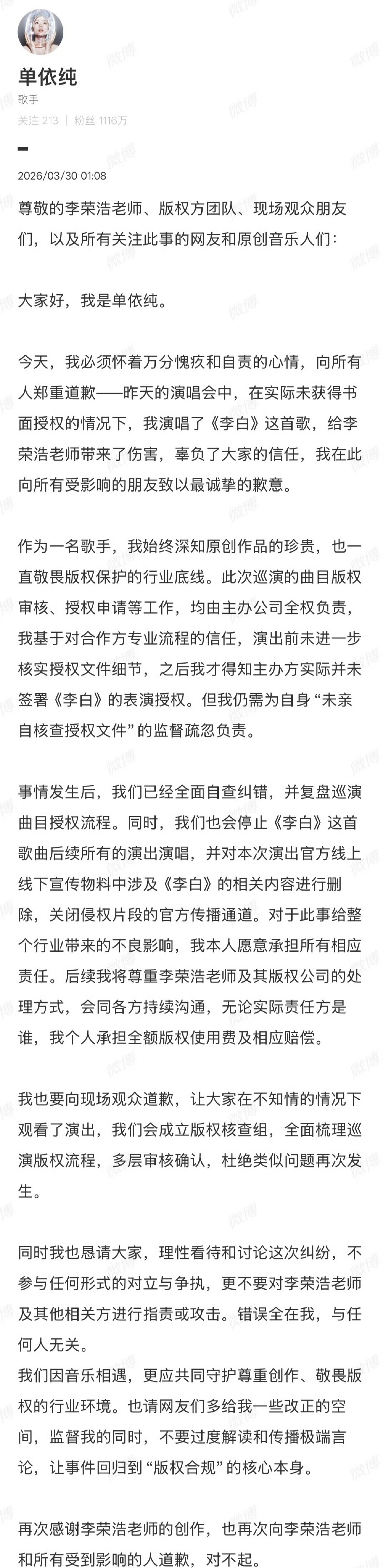单依纯希望让事件回归版权本身单依纯未亲自核查授权文件,让一场演唱会陷入版权风波。从申请被拒到强行演唱,核心问题是责任链条断裂。她将责任揽于己身、积极整改,展现了担当,但“未亲自核查”的疏忽本可避免。这一事件启示所有从业者:版权无小事,任何环节的懈怠都可能引发侵权。唯有强化个人责任、完善全流程核查,才能真正尊重原创、守护行业健康发展。