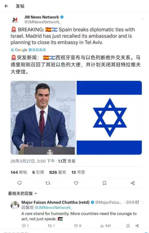 西班牙宣布与以色列断绝外交关系。马德里当局于3月27日召回了其驻以色列大使,并计划关闭其驻特拉维夫大使馆。 可能有人会问,西班牙至于这么较真吗?其实不然,这背后既有国际道义的考量,也有国内政治的推动,更有以色列一次次的强硬反制在火上浇油。早在2023年10月新一轮巴以冲突爆发后,西班牙就已经是欧盟里最早公开谴责以色列军事行动的国家之一,当时就率先实施了对以色列的临时武器禁运,只是那时候还没到彻底撕破脸的地步。 紧接着到了2024年5月,西班牙更是联合挪威、爱尔兰,三国一起正式承认了巴勒斯坦国,这一举动直接惹怒了以色列。以色列当时就立马召回了驻西班牙的大使,还召见西班牙驻以大使狠狠斥责了一番,甚至后来还威胁要关闭西班牙驻耶路撒冷的领事馆,禁止西班牙驻耶路撒冷领事馆向约旦河西岸的巴勒斯坦人提供服务,双方的矛盾从这时候就已经彻底摆到了台面上。 真正让矛盾升级的,是2025年9月西班牙首相桑切斯宣布的一系列针对以色列的措施,这也是西班牙走向断交的关键一步。桑切斯当时直接点明,以军在加沙地带的行动根本不是自卫,也不是单纯的打击行动,而是对手无寸铁的平民实施灭绝,完全违反了人道主义法律。也就是在那天,西班牙宣布了九项措施,包括永久性禁止和以色列做武器、弹药以及军事装备的交易,不让为以军运载燃料的船只停靠西班牙港口,也不让运载以色列国防物资的飞机进入西班牙领空。 除此之外,西班牙还明确规定,那些直接参与加沙地带“种族灭绝”、侵犯人权和犯下战争罪的人,不准入境西班牙,同时也禁止进口在巴勒斯坦被占领土非法定居点生产的商品,目的就是阻止巴勒斯坦人被迫流离失所,推动落实“两国方案”。与此同时,西班牙还加大了对巴勒斯坦的支持,把2026年对加沙地带的人道主义援助预算提高到了1.5亿欧元,差不多相当于1.8亿美元,还增加了对联合国近东巴勒斯坦难民救济和工程处的援助。 面对西班牙的这些措施,以色列的反应那叫一个强硬,当天就展开了反制,直接禁止西班牙副首相兼劳工与社会经济大臣约兰达·迪亚斯、西班牙青年和儿童大臣西拉·雷戈入境,还指责西班牙政府的这些做法是“反犹主义”,甚至暗讽桑切斯是想通过指责以色列,来转移公众对其所属党派腐败丑闻的关注。这种充满诽谤性的指控,再加上禁止西班牙官员入境的举动,彻底让西班牙政府无法接受。 其实西班牙走到断交这一步,也离不开国内的压力。西班牙现在是左翼执政联盟,执政联盟里更左翼的政党一直给政府施压,要求对以色列采取更严厉的措施,而且西班牙国内民众对巴勒斯坦的同情也越来越强烈,之前就有数千人在马德里、巴塞罗那等城市举行示威游行,呼吁政府断绝与以色列的关系,对以色列实施全面武器禁运,民众的呼声也给了政府很大的推动。 很多人可能会觉得,西班牙这是在“孤军奋战”,毕竟欧盟内部在对以色列的态度上分歧很大。确实,欧盟里有德国、奥地利这样传统上亲以色列的国家,它们因为历史原因,一直对以色列保持着支持,也不愿意对以色列实施制裁,而西班牙、爱尔兰等国则坚定地站在巴勒斯坦这边,主张对以色列施压。西班牙的这些举动,也暴露了欧盟在地缘政治议题上的深层裂痕,桑切斯甚至还批评过欧洲在加沙问题上行动太少、为时已晚。 还有一点不得不说,西班牙对以色列的制裁,虽然在军事上的直接影响有限——毕竟以色列的武器主要来自美国、德国和意大利,这三个国家的军售占到了以色列总体军购的99%,西班牙和以色列的武器交易规模本身就不大——但在政治和道义层面的意义却很大。桑切斯自己也承认,这些措施可能不足以阻止以色列在加沙的军事行动,但至少能给以色列政府施加压力,缓解巴勒斯坦民众正在遭受的痛苦。 现在西班牙正式宣布断交,召回大使、计划关闭驻特拉维夫大使馆,意味着两国的外交关系彻底降到了冰点,后续的经贸、文化等各方面的往来也会受到严重影响。但西班牙显然已经做好了准备,毕竟从承认巴勒斯坦国,到加入南非在联合国国际法院对以色列提起的“种族灭绝”诉讼,再到一系列制裁措施,西班牙的立场一直都很坚定。 说到底,西班牙这次断交,不是一时兴起的冲动,而是长期以来对以色列在加沙地带所作所为的不满,是对人道主义的坚守,也是国内民意和政治力量推动的结果。虽然这样的举动可能会让西班牙在欧盟内部面临一些压力,也会和以色列彻底闹僵,但对于西班牙来说,这或许就是他们认为“站在历史正确一边”的选择,毕竟看着加沙地带越来越严重的人道主义危机,越来越多的国家开始站出来,用实际行动向以色列施压,而西班牙,只是走得更坚决而已。 来源:青岛新闻网 【西班牙降级与以色列外交关系】