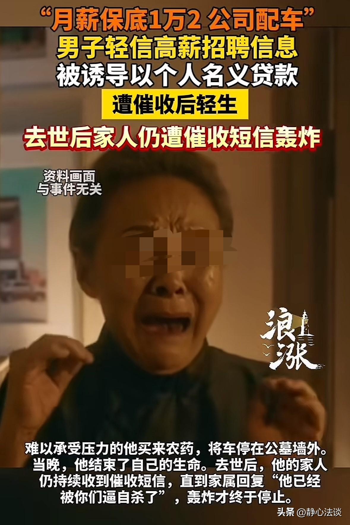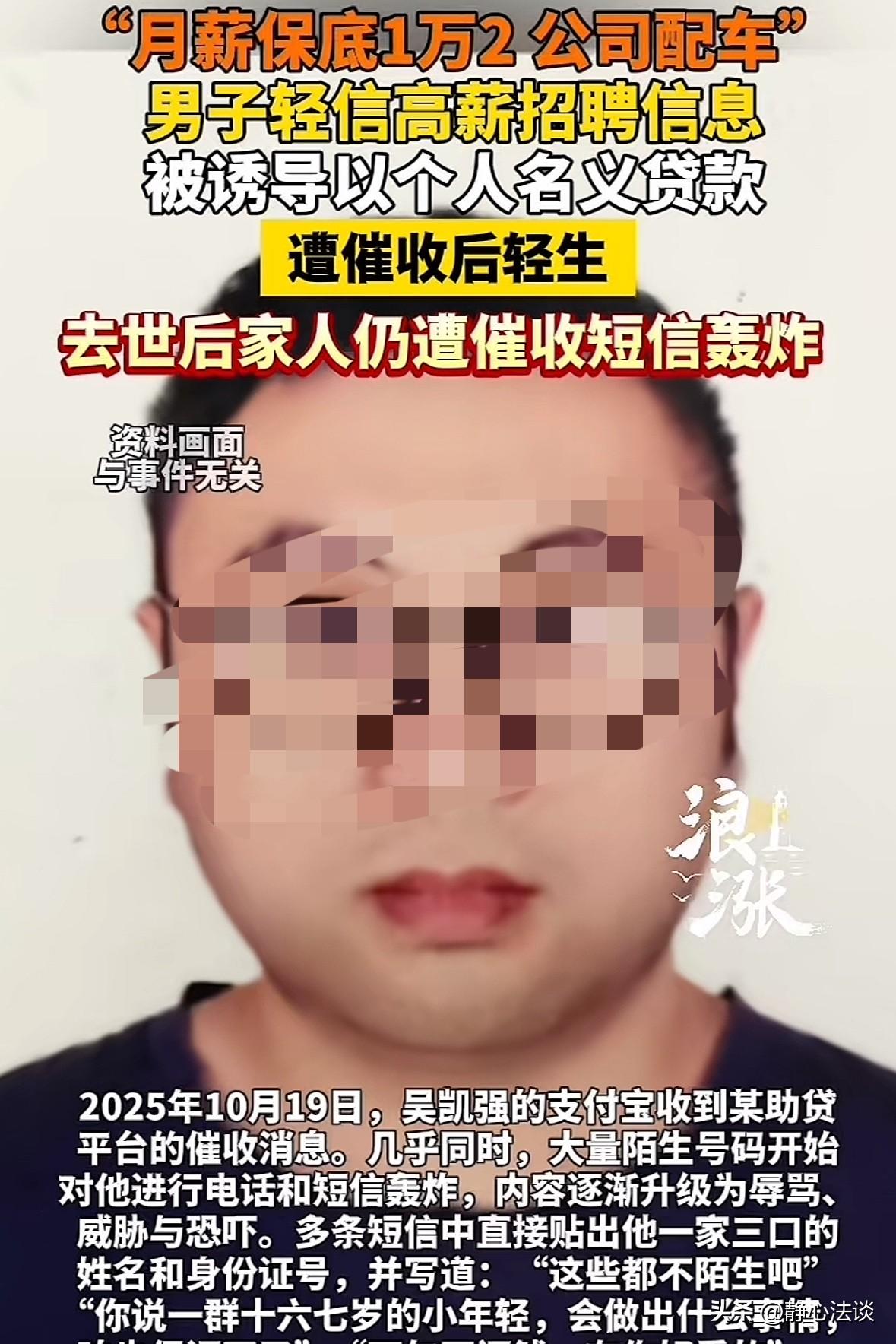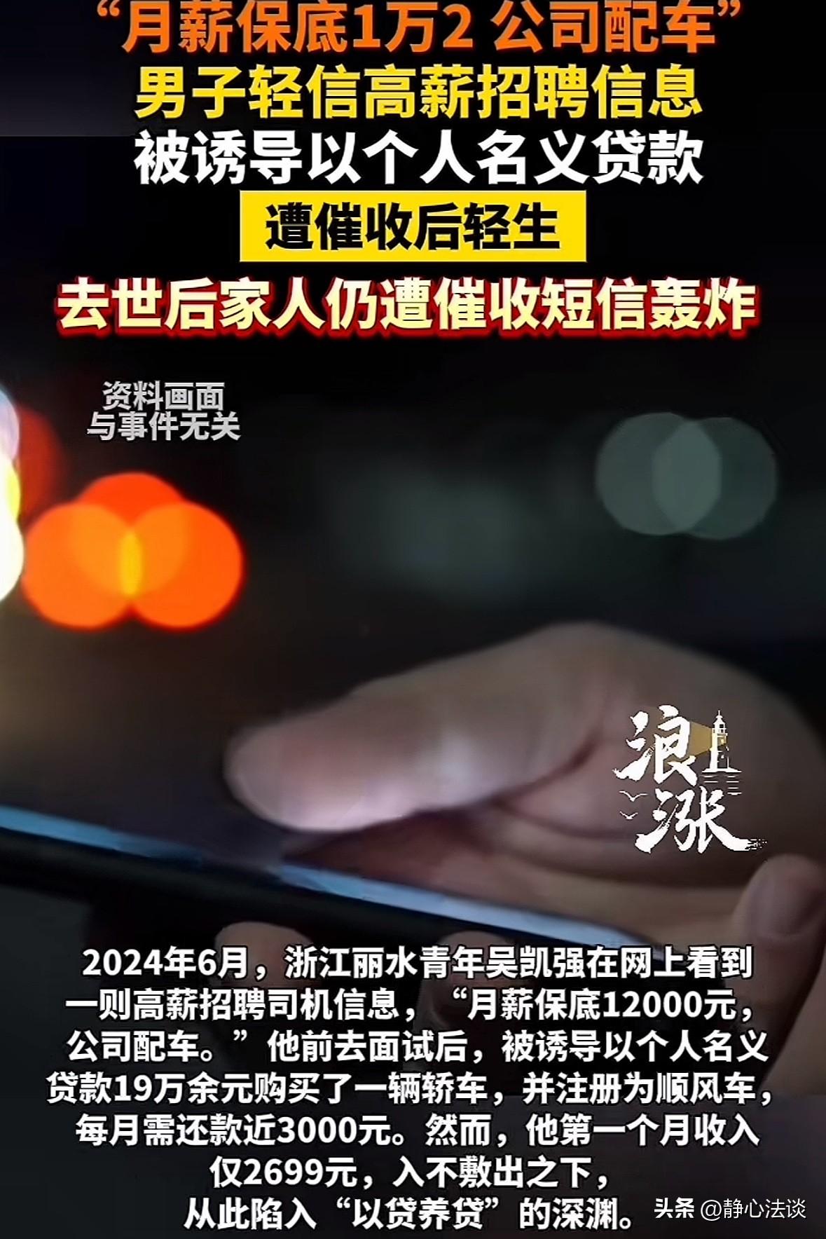 浙江丽水,33岁男子应聘高薪网约车司机工作,没想到面试时被诱导以个人名义,贷款19万余元购买一辆轿车,并注册成网约车,每个月需还3194元,可男子每个夜赚的还不够还车贷,于是在各个平台上借钱,用于借新还旧的方式,没想到滚雪球一样越滚越大,后来男子收到大量催收消息和电话,内容多是威胁和恐吓,甚至涉及家人,男子彻底崩溃,于是买了一瓶农药,在母亲的墓地旁边喝药自杀,谁知道,男子出事后,家人仍持续收到收短信,家属忍无可忍回复:他已经被你们逼没了!网友:死都不怕还怕啥? 月薪保底一万二,公司还配车,吴凯强看到这行字时,眼睛都亮了。 吴凯强刷到个招聘信息的时候兴奋坏了,那可不是小数目,他通过微信联系对方,约好了第二天带着银行卡等证件去面谈。 第二天面试后,他被告知被录取了,吴凯强高兴坏了,兴冲冲的就跟着对方去办理手续。 对方表示上班得有车,需要用吴凯强个人名义贷了个款,但是这活稳赚,而且有公司兜底。 吴凯强没多想,觉得公司兜底四个字就是定心丸。 稀里糊涂就贷了19万多,提了辆新车,还注册成了顺风车司机。 而19万需要分60期还完,每个月需要还3194元。 万万没想到,他跑了一个月,累死累活才赚了2699块,连月贷都不够。 这还没算油钱、保养费,日子刚开头就入不敷出了。 眼瞅着还不上贷款,吴凯强急了,这时有人告诉他可以在某平台借钱,缓解燃眉之急。 吴凯强像抓住救命稻草,贷了款把第一个窟窿填上了。 可这只是开始,没想到雪球越滚越大,他只能再找别的平台借,拆东墙补西墙。 养车要钱,吃饭要钱,还款也要钱,他就这么在借新还旧的循环里打转,把自己捆住。 他每天睁开眼想的就是上哪弄钱,跑车的劲头早没了,眼里只剩绝望。 后来他实在没钱还了,2025年10月19日,吴凯强的手机就炸了。 催收电话一个接一个,短信更是不堪入目,不仅骂他,还把他父亲、姐姐的信息扒出来,告诉他不还钱就等着瞧及你家人也别想好过等。 这些字眼像针一样扎在他心上,他母亲本来就走的早,家里就剩父亲和姐姐相依为命。 本来与自己能赚大钱让他们生活得好一些,没想到却惹了这么大的祸。 现在钱没赚到,还欠了一堆,连家人都要被牵连,他彻底绷不住了。 他留下一封邮件,说对不起爸爸和姐姐,自己实在扛不住了,我每天开车就想多赚点钱,但他们还是不停地给我打电话,还要找你们,我害怕,我对不起你们,是我没本事,我也不想死,可是我太累了,我熬不住了……。 留下这个邮件后,他买了瓶农药,开车到母亲坟头,在绝望中喝了下去。 他姐姐实在联系不上他,吓得赶紧报了警,没想到等待的,还是人已经没了的消息。 家人得知此事后崩溃不已,好好的人怎么说没就没了。 可让他们没想到的是,吴凯强没了,他的家人也并没有因此会免遭影响。 他父亲和姐姐的手机,照样被催收短信狂轰轰炸,亲戚邻居看到那些短信都气得牙痒痒。 姐姐忍无可忍选择报警,但开始并未立案,后来姐姐把吴凯强留下的那封信,才被刑事立案 可是对方的消息始终不停,亲戚朋友都免遭影响,于是回了条:人都被你们逼没了,还要怎么样,那些短信才终于消停。 《刑法》第266条:诈骗公私财物,数额较大的,处三年以下有期徒刑、拘役或者管制,并处或者单处罚金;数额巨大或者有其他严重情节的,处三年以上十年以下有期徒刑,并处罚金;数额特别巨大或者有其他特别严重情节的,处十年以上有期徒刑或者无期徒刑,并处罚金或者没收财产。 招聘方以非法占有为目的,通过虚构高薪配车的招聘事实,诱导吴凯强以个人名义贷款并将款项据为己有或用于其他非法用途,其行为可能构成诈骗罪。 《民典法》第1032条:自然人享有隐私权。任何组织或者个人不得以刺探、侵扰、泄露、公开等方式侵害他人的隐私权。 隐私是自然人的私人生活安宁和不愿为他人知晓的私密空间、私密活动、私密信息。 平台及催收人员泄露吴凯强及其家人的个人信息,属于侵害隐私权的行为。 家属可依据本条,要求侵权方承担停止侵害、赔礼道歉、赔偿精神损害抚慰金等民事责任。 对此,你怎么看这件事!