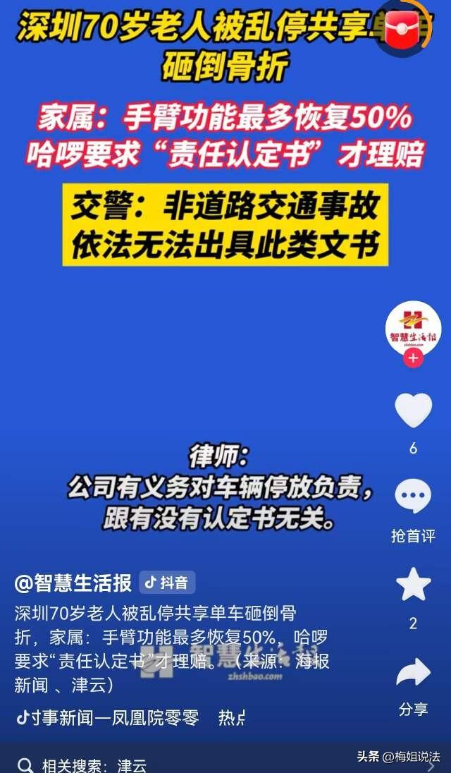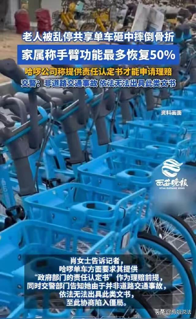 广东深圳,一70岁老人在人行横道行走时,旁边的共享单车突然倒了,正好砸中老人,导致老人摔倒并骨折。共享单车方面要求提供相关责任认定书才能赔偿。可认证证书谁来开呢?没有证书老人的伤就没人管了吗? 老年人嘛,年纪大了都爱遛弯锻炼身体。肖女士的母亲也一样。经常去公园锻炼身体,或者约上几个老姐妹一起溜达去市场买点特价东西。 每次去菜市场都起的很早,买到便宜又新鲜的蔬菜水果时都非常开心。 家人也很支持母亲的做法,一方面老年人醒的早,起来也无聊,出门转转,既对身体好,买到合适的东西她也高兴。既然对身心都有好处,当子女的肯定赞成。 前几天,母亲从长沙来到深圳女儿这,女儿本来很开心,想带下班母亲到处转转,母亲说白天她先自己在附近走走。 肖女士母亲来到这跟往常在家一样,闲不住。吃过饭,准备去溜达溜达,顺便看见什么划算就买点。 正要过马路走人行横道时,一辆共享单车突然倒下,老人根本来不及躲避。单车正好砸在了肖女士母亲的身上,老人直接被砸倒起不来,疼的直叫。 经过送医检查,老人摔倒导致了骨折,全身多处受伤,手臂上的伤最严重,也许最多只能恢复到50%左右的功能,可能导致伤残。 目前,肖女士的母亲已住院十几天了,花费一万多,后续还得不少钱。 肖女士表示,当时共享单车是横着停在路边的,并没有停放在非机动车指定的画线区域内。因此她觉得共享单车公司应对母亲的伤负有一定的责任。 肖女士也找到了共享单车公司,公司方面回应称,如果是他们的问题。他们可以提供赔偿。但需要提供相关部门出具的责任认定书,没有证书,他们也没办法走公司手续。 开始,肖女士觉得公司说的可能也有点道理,走个手续嘛,也正常。 她想母亲是在马路上受的伤,那就去找交通队吧,到了之后,民警告诉她,她母亲摔倒受伤的事,不算道路交通事故。按照相关规定,他们不能出具责任认定书。 就这样,赔偿协商的事到这里卡住了,肖女士不知道谁能给她开这个证书。 如果开不出来责任认定证书,母亲就白受伤了吗?肖女士心里不服。 肖女士说如果母亲是自己摔倒的,他们肯定没啥说的,现在明明是被违规停放的共享单车砸倒的,而且受了伤,这件事怎么可能就这样过了! 监控上拍的清清楚楚,事实很明确,怎么就不能赔偿呢? 目前,共享单车公司回复称,暂时还没有处理结果,但他们已经让肖女士上传了母亲的医疗费用票据,他们也正在找伤情鉴定机构。 但针对肖女士所说的赔偿及出具责任认定书的事,共享单车公司暂未回应。 《民法典》第1165条:行为人因过错侵害他人民事权益造成损害的,应当承担侵权责任。依照法律规定推定行为人有过错,其不能证明自己没有过错的,应当承担侵权责任。 共享单车公司有义务对自家公司的车辆停放负责,如果因为共享单车停放位置不正确,造成第三方受伤,单车公司就应该承担责任,与认定书没有关系。 肖女士母亲被单车砸中受伤一事,事实清楚,单车公司存在过错,应承担相应的赔偿责任。 《民法典》第1198条:宾馆、商场、银行、车站、机场、体育场馆、娱乐场所等经营场所、公共场所的经营者、管理者或者群众性活动的组织者,未尽到安全保障义务,造成他人损害的,应当承担侵权责任。 因第三人的行为造成他人损害的,由第三人承担侵权责任;经营者、管理者或者组织者未尽到安全保障义务的,承担相应的补充责任。经营者、管理者或者组织者承担补充责任后,可以向第三人追偿。 本案中,共享单车公司在管理方面未没有尽到安全保障义务。因管理不当,共享单车没有按规定停放,车倒砸人,给肖女士母亲造成人身伤害,存在一定过错,肖女士一家有权要求单车方承担责任。 本案还存在第三人也就是最后的骑行者,他的违规停放的问题,也是导致肖女士母亲被砸的原因之一。单车公司向肖女士赔偿后可以找最后的骑行者追责。 在这里提醒大家,共享单车虽方便,大家一定要规范停车。 大家对此案怎么看?欢迎评论留言。