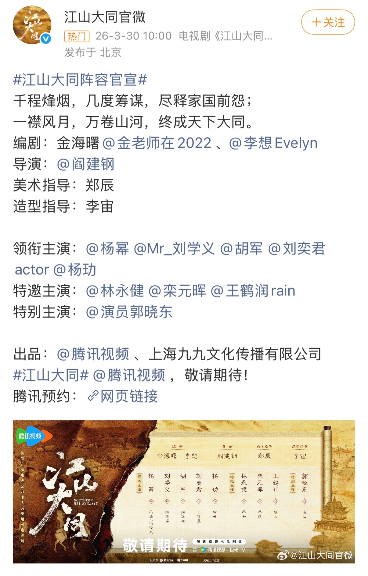 历史剧《江山大同》演员阵容官宣,杨幂工作室广场很是热闹,因为新剧官宣对接没有提前告诉粉丝,也没有单独换行官宣。