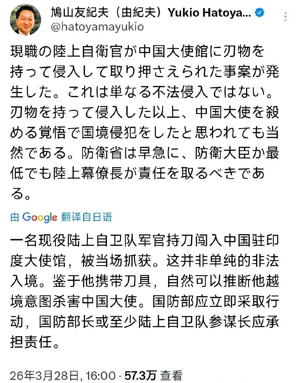 一把18厘米的刀,照见日本社会的深层隐忧 2026年3月24日,东京发生了一则牵动外交神经的事件:一名日本陆上自卫队现役三等陆尉,携18厘米长刀,翻墙闯入中国驻日大使馆并扬言伤害外交人员。事件本身性质严重,而日本官方仅以“感到遗憾”回应,既无正式道歉,也未承诺彻查,这种轻描淡写的态度,引发了外界对其国内政治与社会生态的更深担忧。 表面看,这是一起孤立的极端个案。但结合日本近期的舆论环境、武装力量内部状况及当局应对方式,不难发现其中折射出的,是社会肌体长期积累的几类结构性问题。 一、舆论生态的扭曲:偏见如何被系统性塑造 近年来,日本部分主流媒体在对华报道上呈现出显著的一致性:无论中国在哪个领域取得发展或采取合理举措,最终都被贴上负面标签。国防建设被解读为“威胁”,经济合作被歪曲为“陷阱”,主权维护被曲解为“霸凌”。这种报道模式并非个别偏差,而是呈现出高度的系统性与倾向性。 信息茧房的效应在此显现。大量日本民众长期接触单一视角的内容,对中国的认知逐渐脱离事实基础,取而代之的是被筛选、被修饰后的“想象形象”。此次使馆遇袭事件后,部分媒体报道刻意淡化涉事者的自卫队身份与事件的外交性质,将其简化为普通治安案件。当媒体不再以真相为第一要务,而是成为情绪与偏见的放大器剂,社会的理性空间便会被不断挤压。 二、自卫队内部的思想隐患:旧阴影难散 事件的特殊之处,在于肇事者并非普通民众,而是现役自卫队军官。受过专业训练的军事人员,持刀闯入他国使馆,这一行为背后的政治动机与思想背景值得警惕。 二战结束近八十年,日本国内对侵略历史的反思仍存在深刻分歧。部分右翼势力否认南京大屠杀、美化侵略战争、将甲级战犯供奉于靖国神社,这些观念并未彻底消失,反而以不同形式渗透到公共话语中。自卫队作为国家武装力量,内部思想教育若缺乏严格的正向引导,极可能成为极端思想的滋生土壤。 近年来,自卫队内部不时曝出军官鼓吹战争、发表极端言论、参与暴力事件等丑闻。纪律松散、约束不足、极端思想抬头,已成为不容忽视的隐患。此次持刀闯馆行为,不仅是对国际法的公然违反,更折射出部分人员对邻国的敌意与对规则的漠视,让人不禁联想到日本军国主义时期的某些劣根性。 三、当局的应对与代价:回避难掩深层矛盾 面对这一直接违反《维也纳外交关系公约》的事件,日本政府的回应显得敷衍。警方仅以“非法侵入建筑物”等轻罪立案,完全回避事件的暴力性质与外交严重性;防卫省、外务省高层未作出正式道歉,也未提出彻底调查的承诺。 这种应对背后,是对国内极端势力的纵容,也是对国际法的轻视。日本当局深知国内极右思潮与舆论环境的问题,却未采取有效措施加以整治,反而可能在某些时候利用这种社会情绪为自身政策背书。在历史问题上挑衅、在领土争端上强硬、在国际场合跟风指责,这种做法或许能短期迎合部分民意,却长期侵蚀国家的国际信誉,最终也会反噬自身的安全与发展。 结语:反思与整改,才是走出困局的关键 一把18厘米的刀,不仅是一次暴力行为的载体,更是一面镜子,照见了日本社会在舆论、思想与治理层面的多重病灶。舆论失去理性,社会便易滋生偏见;武装力量内部思想不纯,安全便难有保障;当局选择回避而非整改,矛盾只会越积越深。 中日关系的健康发展,需要两国共同努力。而日本若想真正走出当前的内外困局,首先需要正视自身问题,进行彻底的反思,以真诚的态度对待历史与邻国,以切实的行动整治内部隐患。 这不仅关乎双边关系,更关乎国际社会对规则与正义的信任。每一个关心国际局势、重视国家尊严的个体,都有理由关注这一事件的后续走向,因为它触及的,是地区稳定与全球秩序的根本。