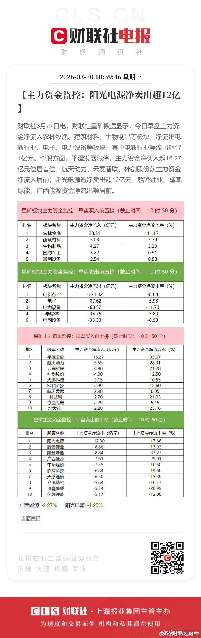 今日早盘主力资金净流入农林牧渔、建筑材料、生物制品等板块,净流出电新行业、电子、电力设备等板块,其中电新行业净流出超171亿元。