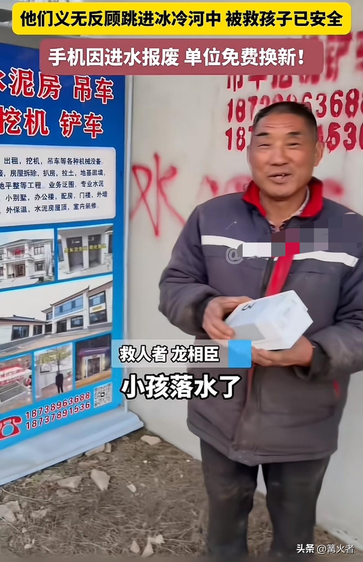 救人英雄找到了,60岁的龙相臣和45岁的代艳合大哥当时听到有人小孩子呼救,连棉衣棉鞋都没脱,就一头扎进冰冷刺骨的河水里,他们在浑浊的水中摸索了五六分钟,手脚冻得几乎失去知觉,才将昏迷的男童救上了岸,他们的手机因进水损坏报废,工厂单位为他们免费更换了新手机,这便是平凡人的伟大之处。