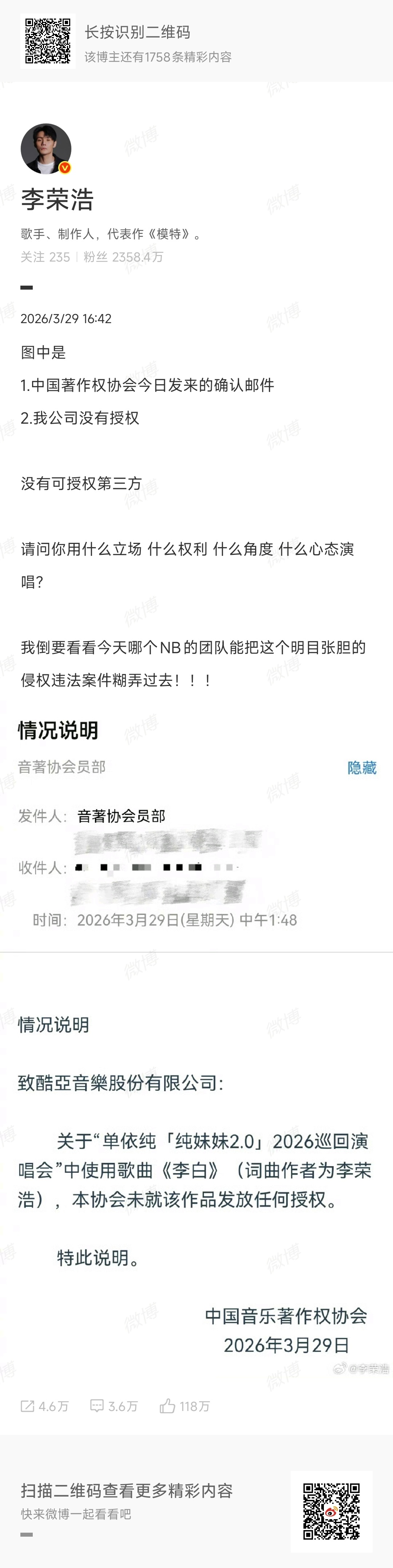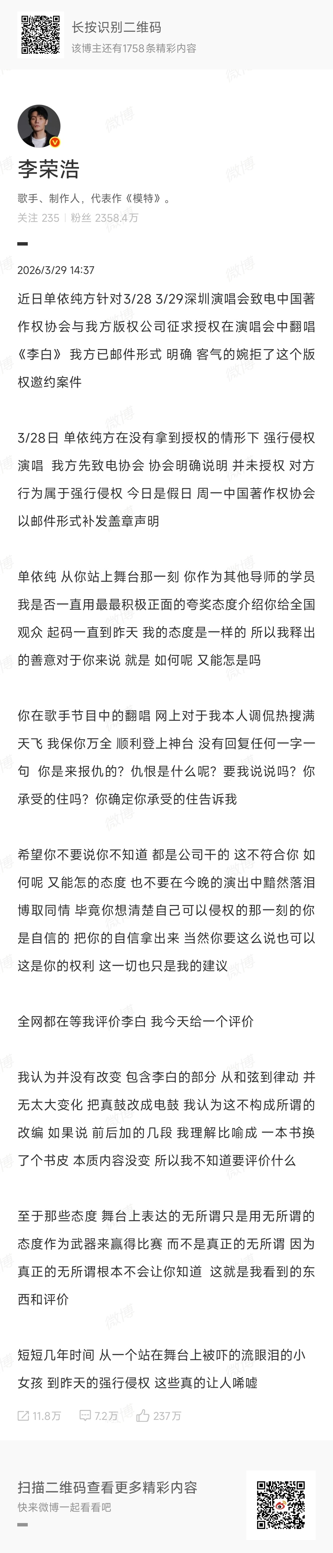 第一波是29日李荣浩质疑拒绝单依纯唱李白,单依纯依然商业演唱改的李白并谋利。