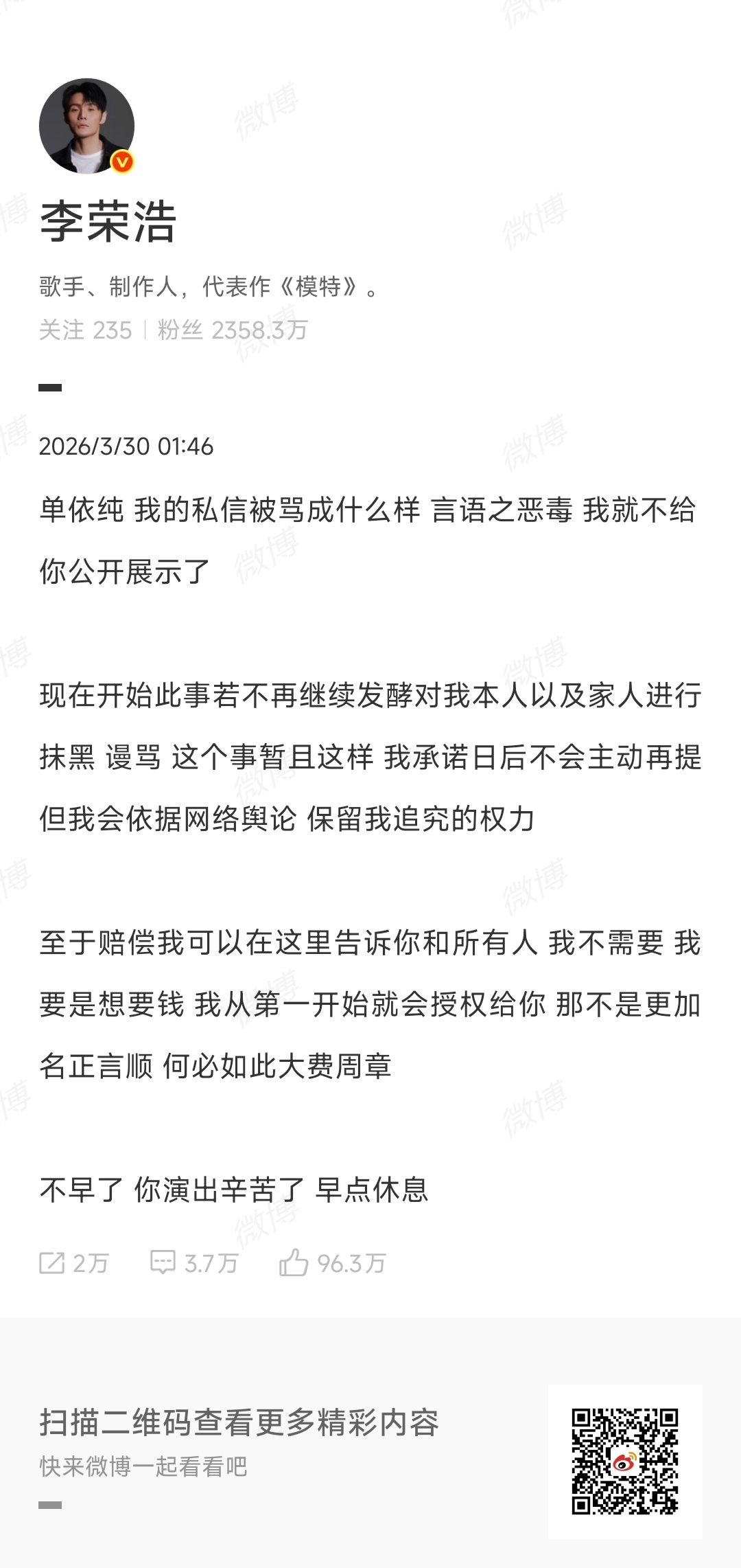 第二波是单依纯道歉,称信任主办方,没有核查,承担责任。李荣浩称到此为止,演唱辛苦了。两人纠纷结束。