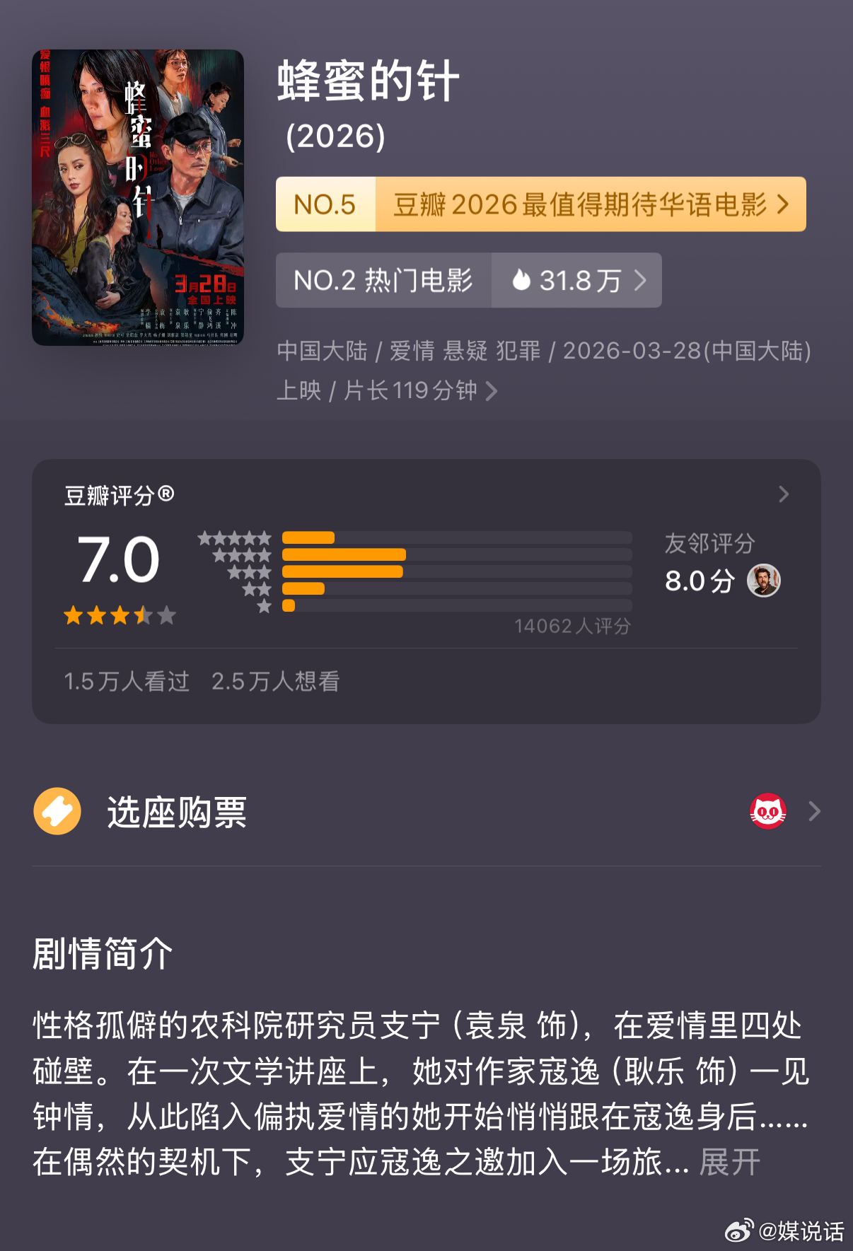 《蜂蜜的针》豆瓣开分7.0,感觉低了!赵薇