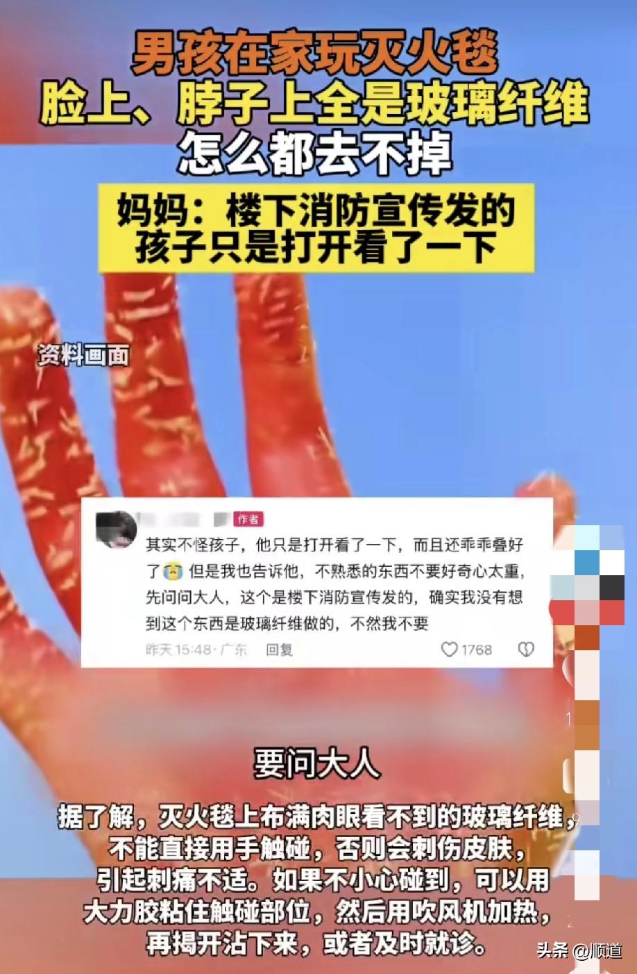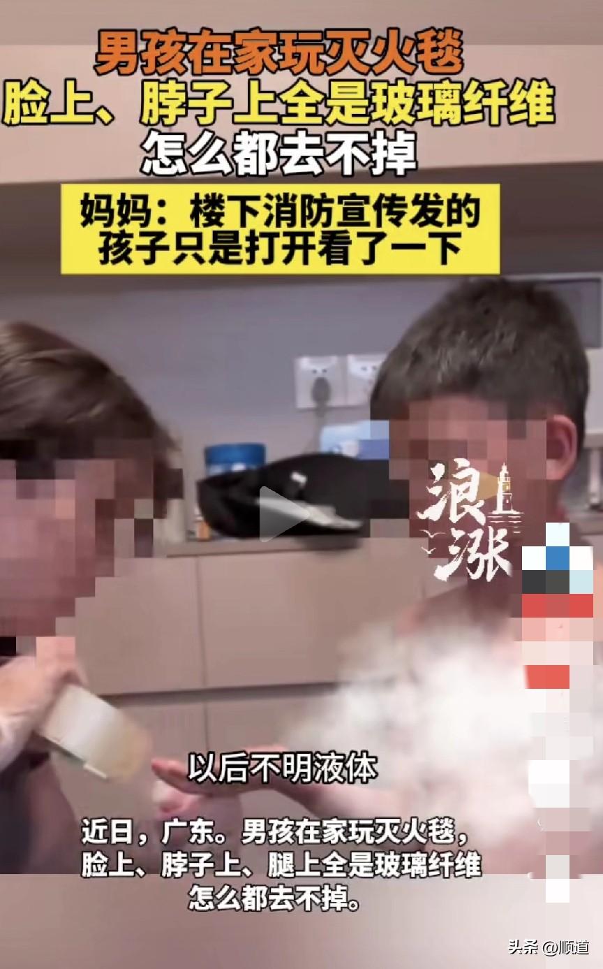 近日,广东,由于楼下消防宣传发了一个灭火毯。 男孩儿出于好奇就打开了,然后又折叠起来装好。 没想到男孩儿的手上脸上脖子上全是玻璃纤维,怎么都弄不掉。 最后是用强力胶带给粘下去的。 我也是太孤陋寡闻了,灭火毯我还是头次听说。 查了一下,原来灭火毯是由玻璃纤维或陶瓷纤维经特殊处理编织而成。不燃,耐高温,无化学药剂。灭火原理是覆盖火源,隔绝氧气。 主要用于厨房油锅等初期小火,也能包裹着火人身,在逃生时披裹身体隔热防烫。 但我还是不明白假如披上灭火毯逃出去了,弄一身玻璃纤维怎么处理呢?这玩意儿这么不结实,玻璃纤维咋能哪都粘呢?还是灭火毯过期了?
