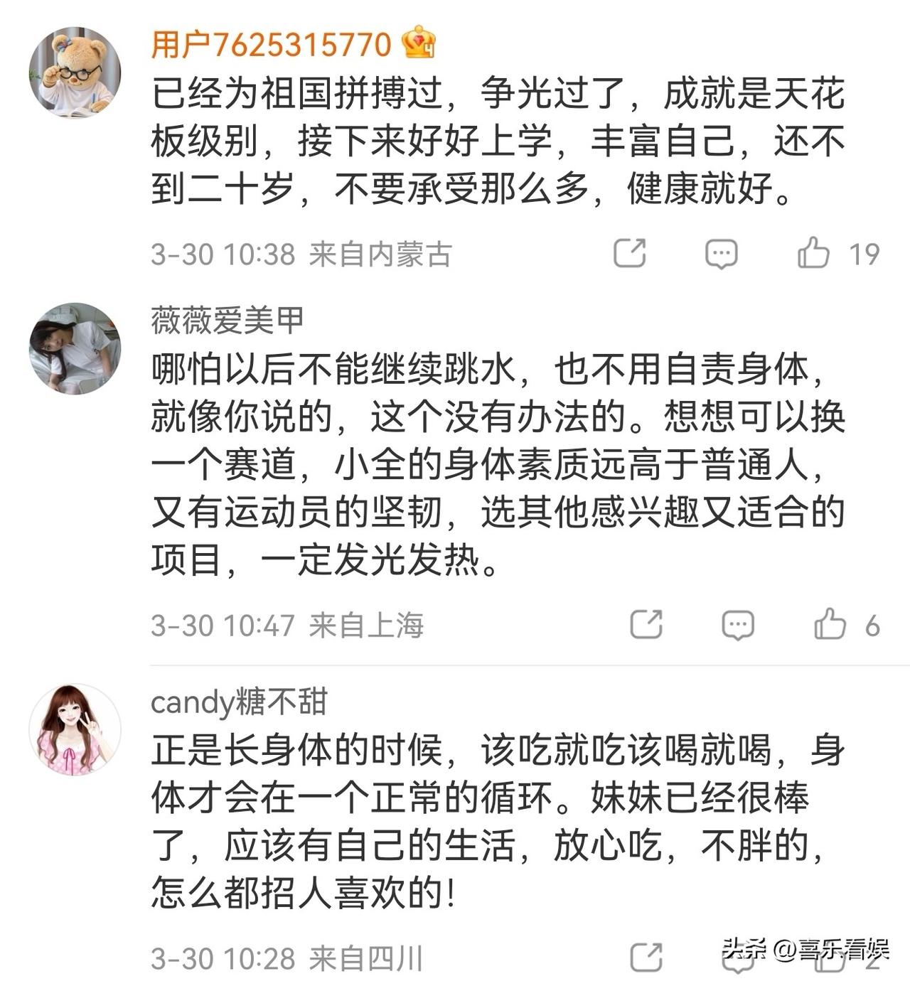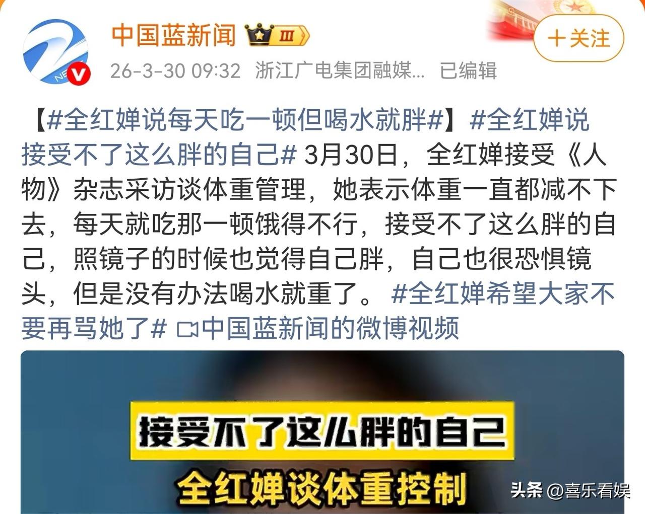 全红婵,让人泪目! 3月30日,全红婵的一段采访突然冲上热搜,好多人看完都红了眼眶,这到底是咋回事? 原来她在接受《人物》杂志采访时,聊起了体重管理的烦恼,语气里全是委屈和焦虑。 她说自己体重一直减不下去,每天只敢吃一顿饭,饿得直难受,可就算这样,喝口水都能变重。 她接受不了现在“胖胖”的自己,照镜子的时候都嫌自己胖,甚至害怕面对镜头,最后还小声求大家:“希望大家不要再骂她了”。 这段采访一放出来,网友们直接破防了,好多人留言说“全看完,不知道为什么眼泪掉下来”“看完整版,看哭我了”,隔着屏幕都能感受到大家的心疼。 有人劝她:“已经为祖国拼搏过,争光过了,成就都是天花板级别的,还不到二十岁,别承受那么多,健康就好。” 还有人安慰她:正是长身体的时候,该吃就吃该喝就喝,不用自责,就算以后不跳水了,凭着运动员的坚韧,换个赛道也能发光。 众所周知,全红婵是那个站在跳台上无所畏惧的天才少女,拿遍了金牌,是为国争光的小英雄。 而现在,她也只是个十几岁的小姑娘,却要被体重、被舆论绑着,连好好吃饭都成了奢望。 我想说,她已经拼尽全力为我们带来过荣耀了,接下来就该好好做自己,不用活在别人的眼光里,健康快乐,比什么都重要。 对此,你们怎么看?