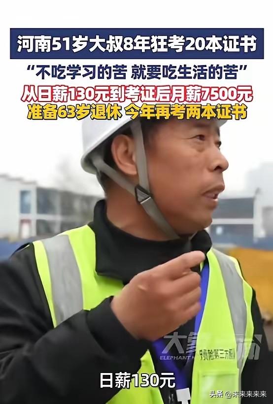 43岁从河南老家远赴杭州打工,初中学历,只能在工地做最繁重的体力活,日薪130元;51岁的如今,手握20本职业证书,即将拿到土木工程本科文凭,做着轻松体面的安全巡检工作。河南的苏先生,用8年的持续学习,走出了一条普通人的向上之路。 2018年前后,43岁的苏先生离开家乡,到杭州讨生活。没有过硬的文凭,没有傍身的技能,他能选择的,只有工地上最苦最累的活计。每天起早贪黑,奔波劳碌,一天忙活下来,到手只有130元。这样的日子过了些时日,他心里清楚,单靠出卖力气,终究不是长久之计,没技术没文凭,只能一直困在生活的苦里。 心里有了改变的念头,便要落到实处。苏先生没有只停留在空想,他开始挤时间学习,每天收工回到出租屋,旁人歇下放松的时候,他就着灯光挑灯夜读。功夫不负有心人,他顺利拿到了人生第一本建筑电工证。凭着这本证书,他很快找到了一份月薪7500元、包吃包住的工作,日子一下子有了明显的起色。 第一次靠学习尝到了甜头,苏先生更坚定了走下去的想法。之后的8年里,他把所有空余时间都放在了学习上,一本接一本的证书,是他一步一个脚印的证明。8年时间,他一共拿下了20本职业证书,覆盖建筑行业多个细分领域。与此同时,他的学历也在稳步提升,从初中起步,一路往上,今年六七月份,他就能拿到土木工程专业的本科毕业证书。 现在的苏先生,早已不用再在工地上靠卖力气谋生。他如今的工作是工地安全巡检,每天跑两三个工地,单次检查三个小时左右,工作轻松,也足够体面。今年他已经51岁,却没有停下学习的脚步。他说,自己计划学到63岁再退休,今年已经考下了两本证书,接下来还打算再考两本。 我们常听人说,不吃学习的苦,就要吃生活的苦。但大多时候,我们只是把这句话当成一句听过就忘的俗语,很少有人真的用行动去印证。苏先生的经历,最难得的不是他考了多少本证书,也不是他从初中读到了本科,而是他在43岁、很多人觉得人生已经定型的年纪,敢下定改变的决心,并且用8年的时间,日复一日地坚持了下来。 人生没有固定的时刻表,只要肯动身出发,什么时候都不算晚。
