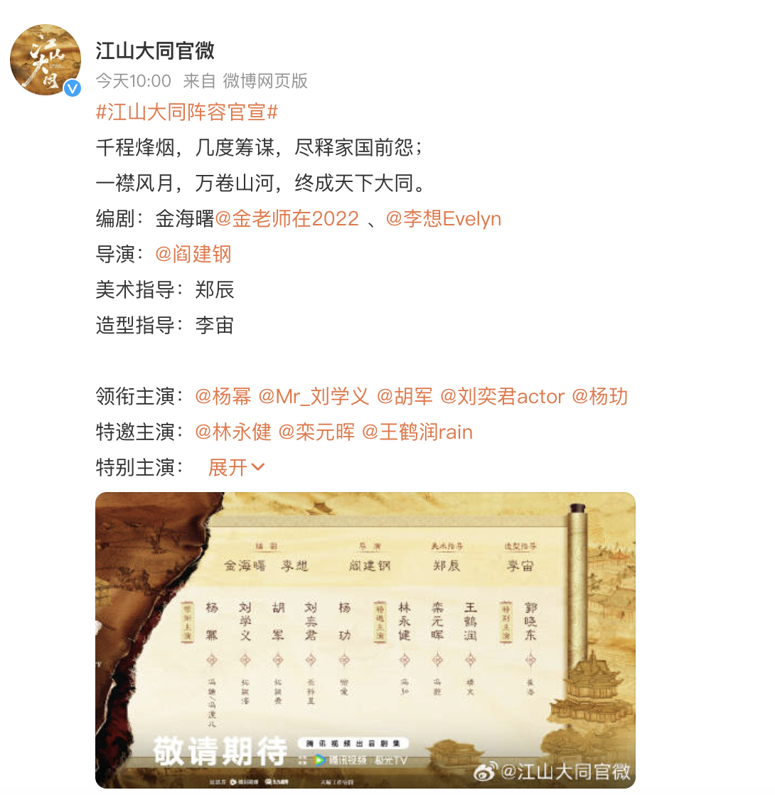 广电总局重大历史题材电视剧《江山大同》今日官宣阵容!大家期待吗?编剧:金海曙、