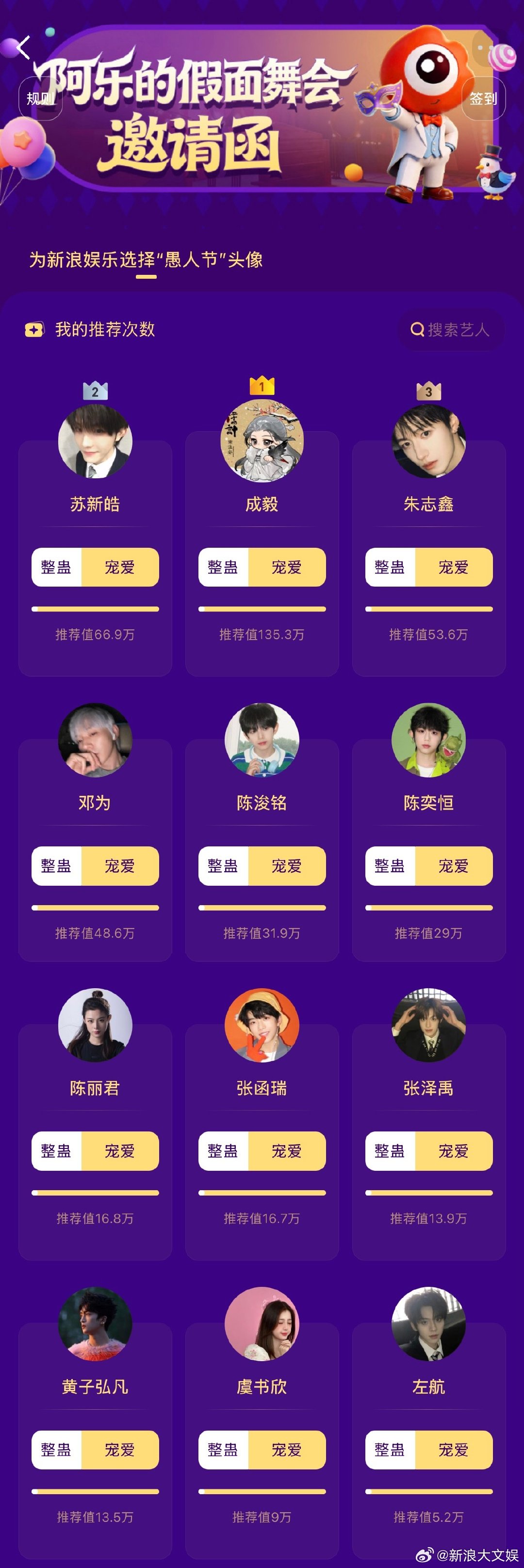 新浪娱乐又要换头像了 愚人节换头像活动火热进行中!🔥暂列top3,紧随其后!推荐将于3月31日12点截止,速戳【阿乐的假面舞会邀请函】推荐你担,阿乐将在4月1日换上最终TOP6艺人头像!