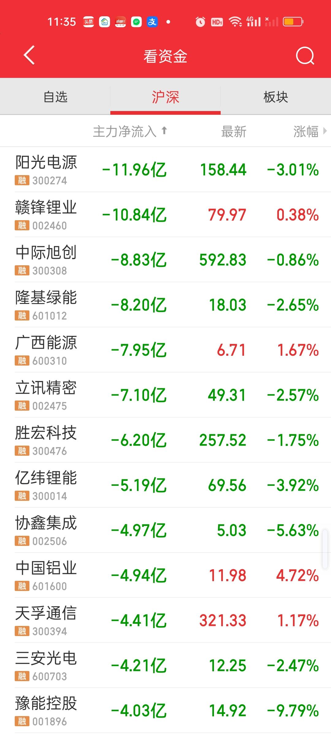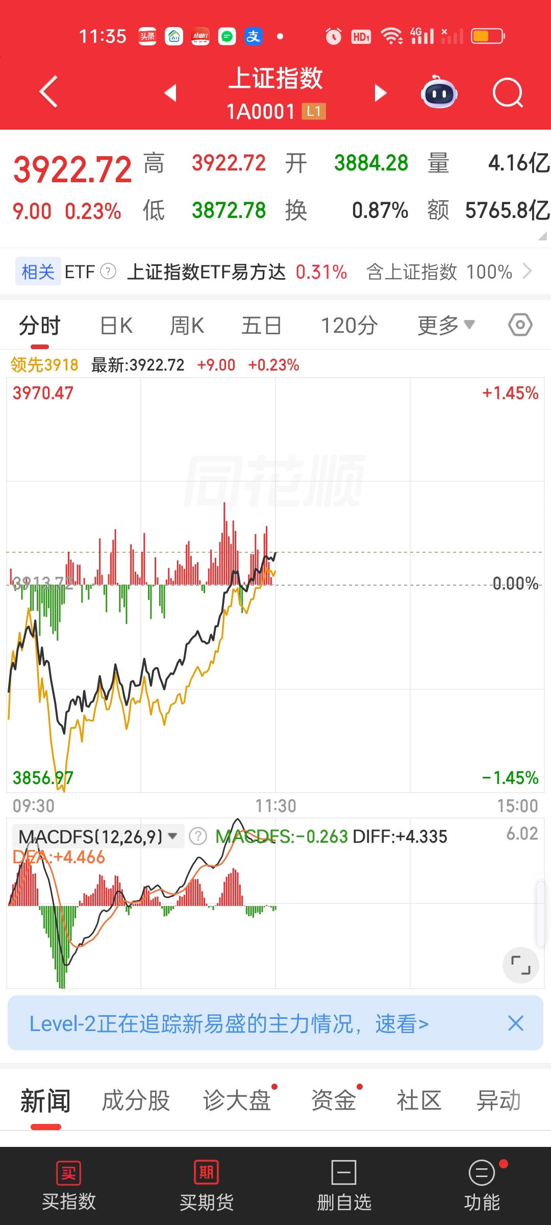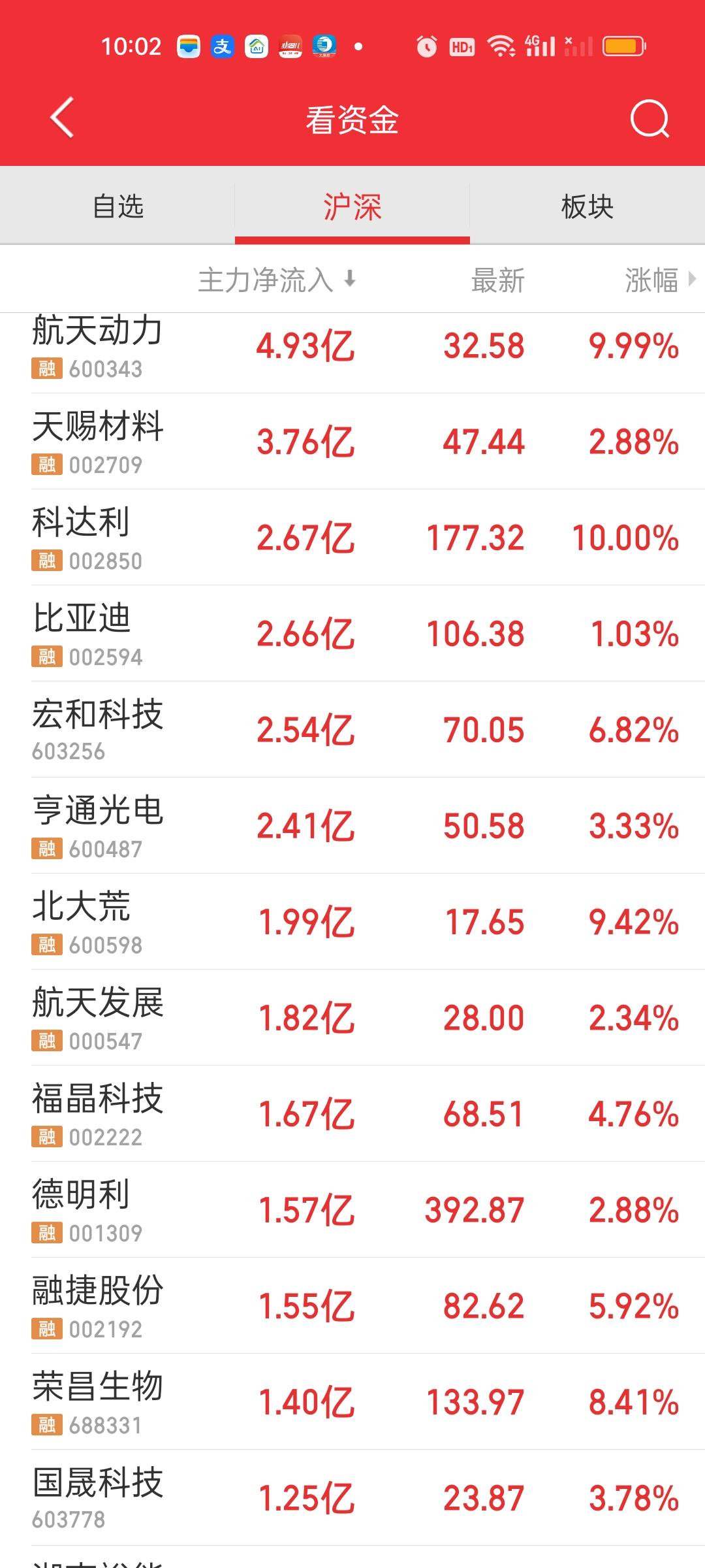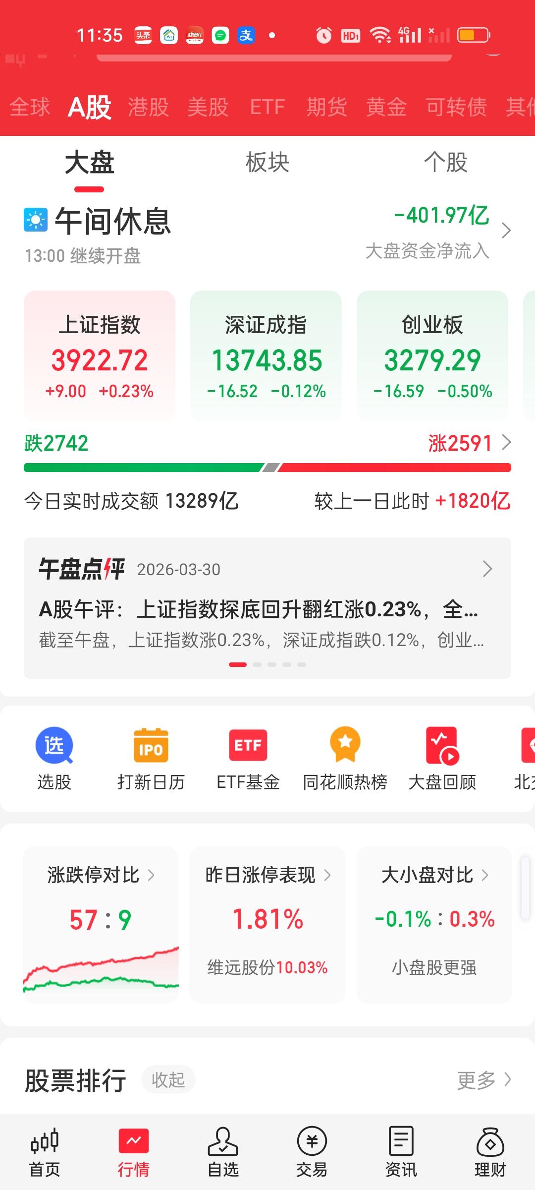 中午收盘了,成交量放量了1820亿,大盘资金净流出401.97亿,成交量相比开盘半小时是放量的状态,大盘资金也净流入了32亿,指数尾盘是爆拉的状态。说明尾盘买进的人很多。中午收盘也收到了日内最高点。这说明下午还会有高点。 但不要高兴太早,有高点不代表会维持在高点,下午下杀是肯定跑不掉的。要密切关注石油走势。上午尾盘石油有急速跳水,从涨3.75%掉到了涨0.98%。下午如果又涨到3.5%以上,指数还要掉不少。另外,很长时间没动的商业航天是今天涨得最好的板块。
