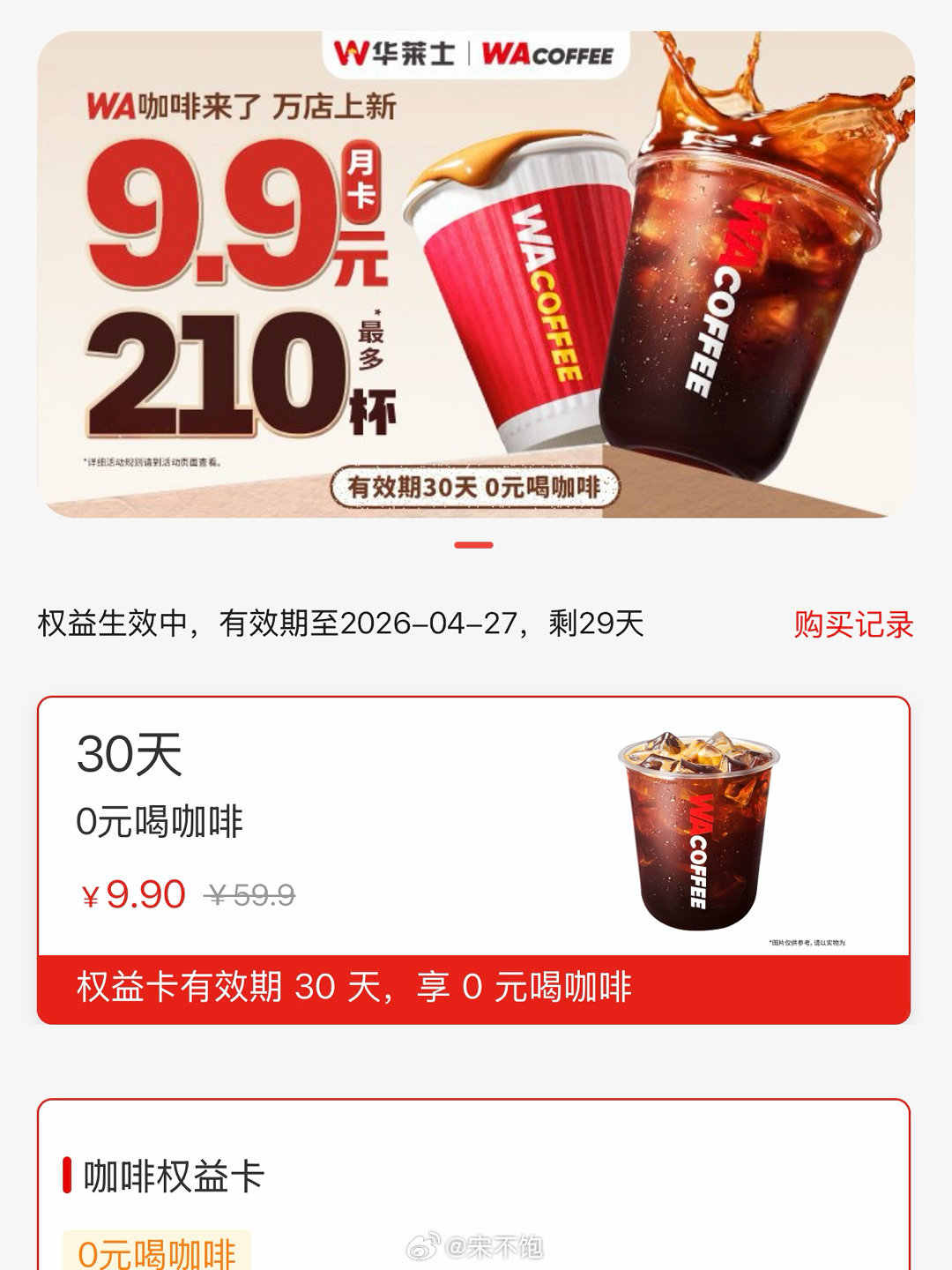 9块9包月打工人咖啡自由华莱士的9.9咖啡月卡大家都薅上了没!我这都是第三张了!工作日送娃上学后顺路打杯咖啡带着去工作,自从有了这9.9月卡,我家咖啡机都闲置了。不光是实现咖啡自由,最重要的是品质还十分在线!这浓厚的油脂,拿来加奶就是一杯高品质拿铁,加冰加椰子水,那就是一杯清爽椰青美式,各种DIY,算下来比自己买豆子都要划算的多。周末带娃,体力精力全天候在线,我直接上午一杯下午一杯每天隔两小时就能来一杯,一个月最多210杯,质价比拉满啊!