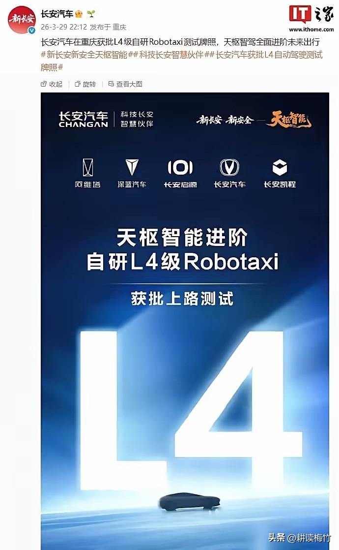 厉害!长安在重庆拿到L4级Robotaxi测试牌照! 什么是L4级Robotaxi,简单来说就是类似于无人驾驶出租车,车里不再有方向盘,是完全的无人驾驶,而不是辅助驾驶! 而且这次长安拿到牌照测试的还是自研的无人驾驶,敢在重庆这地形如此复杂的8D魔幻城市干这事,看来长安的无人驾驶技术做的不错啊! 说不准哪一天,你就可以在重庆街头打一辆没有司机的无人驾驶出租车了!