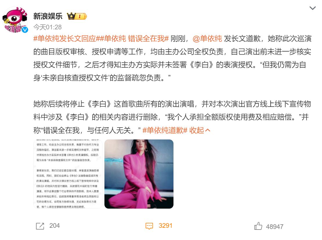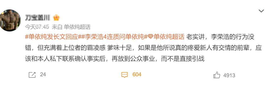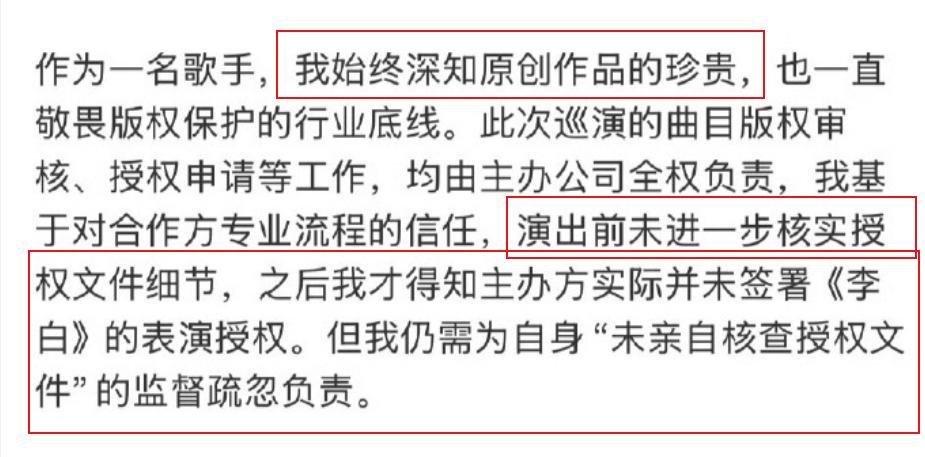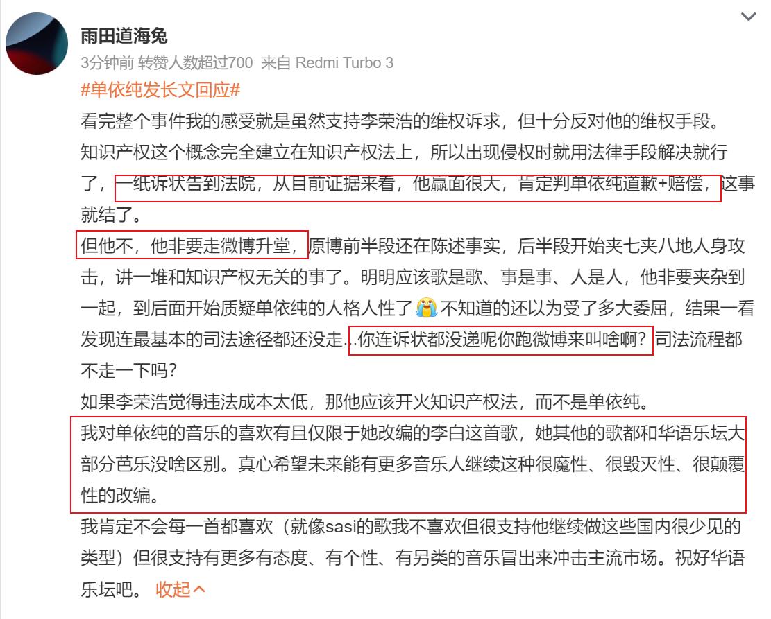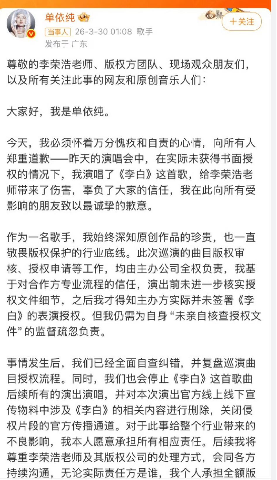 单依纯的公关也太厉害了,李荣浩正当维权,被冠上上位者霸凌? 事情起因很简单,单依纯深圳演唱会,演唱了未经李荣浩同意的《李白》,此前李荣浩已经十分明确地回复单依纯团队,不同意《李白》的版权邀约。 深圳演唱会有两天,单依纯强行侵权,如果李荣浩3月29日没有发声公开,大概率晚上单依纯还会强行侵权,继续演唱《李白》。 对于有些完全无视版权的人,公开她的行径是最好的办法之一,李荣浩的维权可以说既正当也合理。 不过他的这些合理行为,现在却被冠上了上位者霸凌的帽子,认为李荣浩如果觉得单依纯侵权,可以走司法途径,而不是在网上网曝。 大家知道,司法维权的有一定的延时性,而单依纯在接下来的一个月里,还有两场演唱会,《李白》是必唱曲目之一, 公开她的强行侵权行为,可以说是李荣浩维权的最好方式之一。 现在,明知侵权依然强行侵权没问题,反而是维权方要注意方式方法,不能伤到侵权者,这是哪门子的道理。 更过分的是,版权审核是音乐演唱会的核心职责,单依纯把自己失职,用一句基于对团队的信任甩锅,实在贻笑大方。