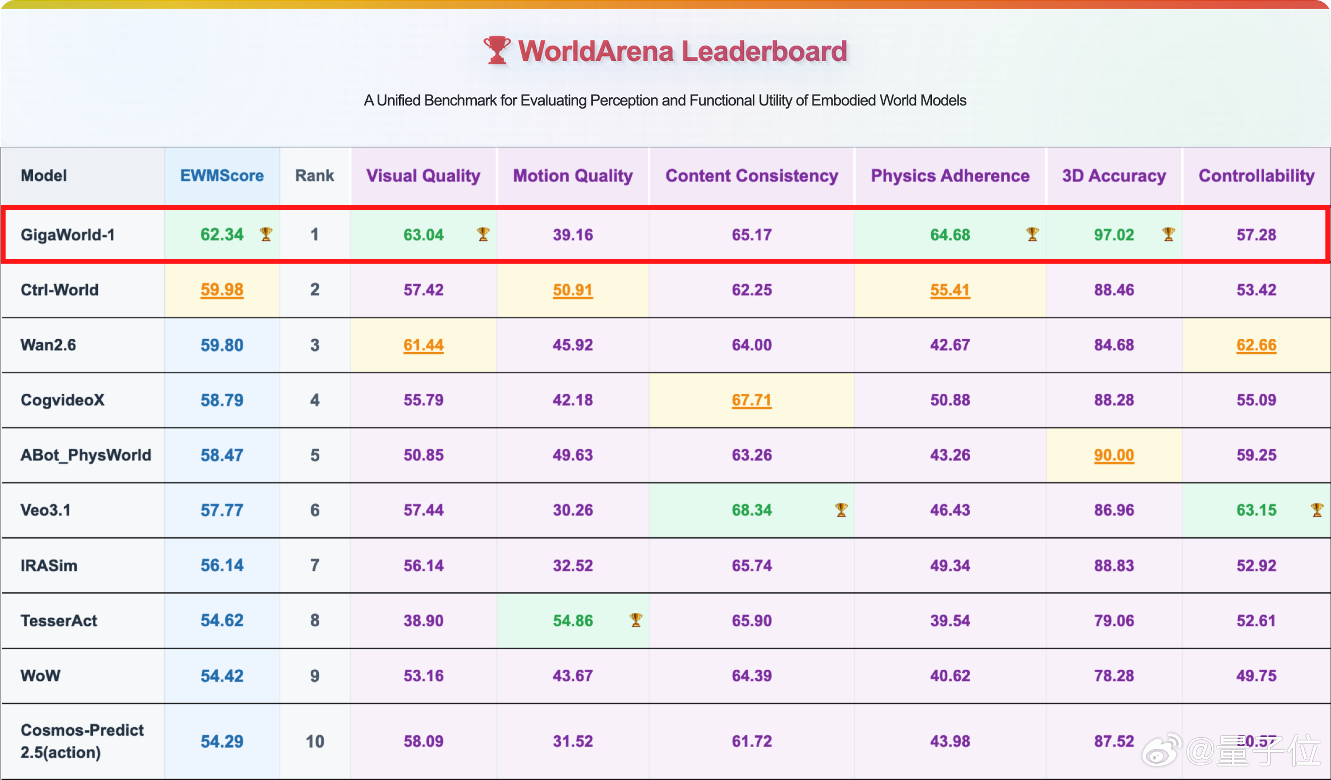 极佳视界最新力作GigaWorld-1,直接击穿谷歌英伟达,WorldArena登顶全球第一。