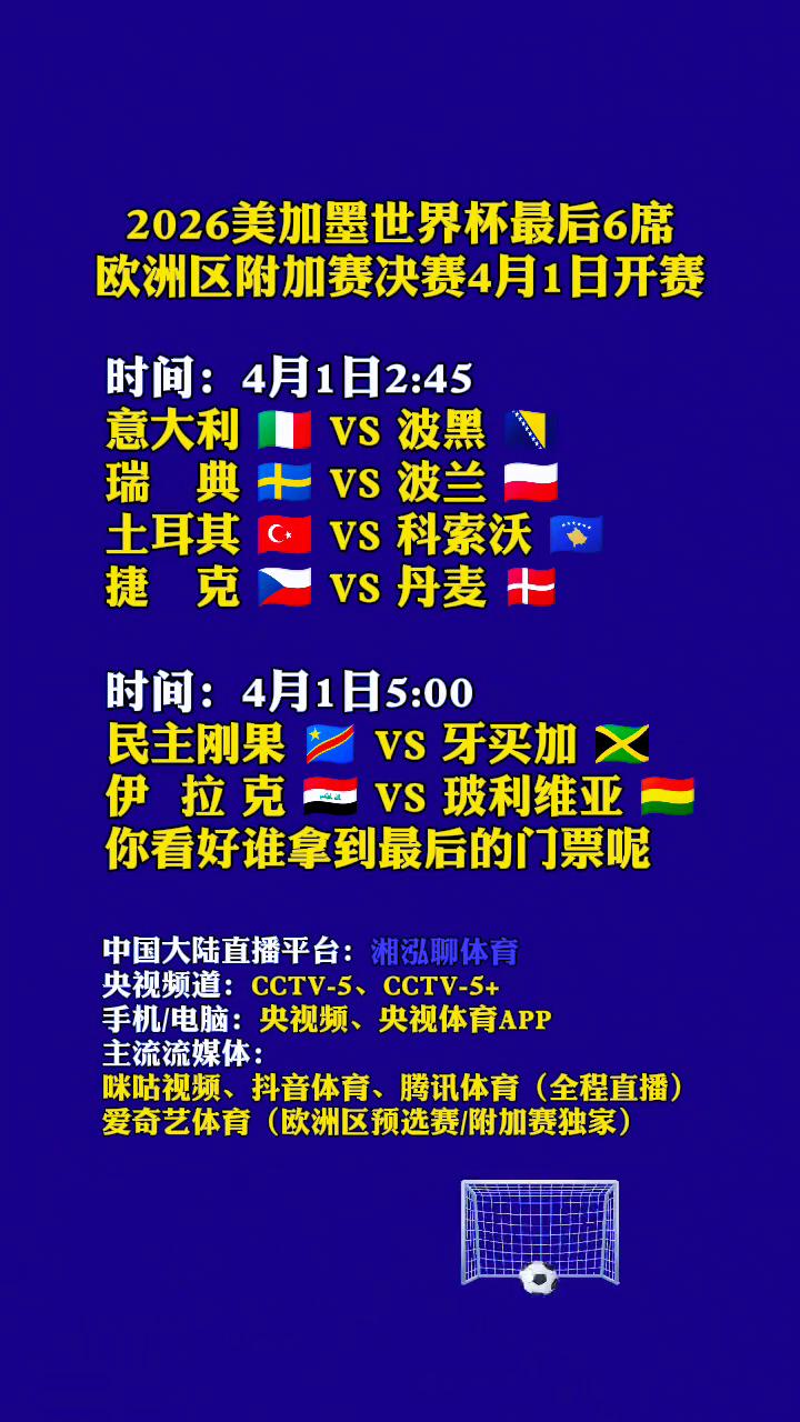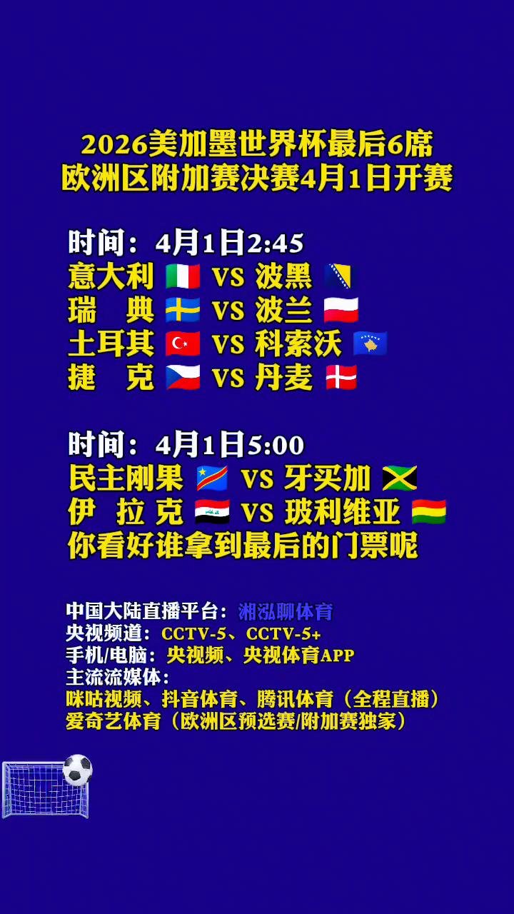 2026美加墨世界杯最后6席欧洲区附加赛决赛4月1日开赛。 时间:4月1日2:45。 意大利VS波黑。 瑞典+VS波兰。 土耳其VS科索沃。 捷克VS丹麦。 时间:4月1日5:00。 民主刚果VS牙买加。 伊拉克VS玻利维亚。 你看好谁拿到最后的门票? 中国大陆直播平台:湘泓聊体育。央视频道:CCTV-5、CCTV-5+。手机/电脑:央视频、央视体育APP。主流流媒体:咪咕视频、抖音体育、腾讯体育(全程直播)。爱奇艺体育(欧洲区预选赛/附加赛独家)。