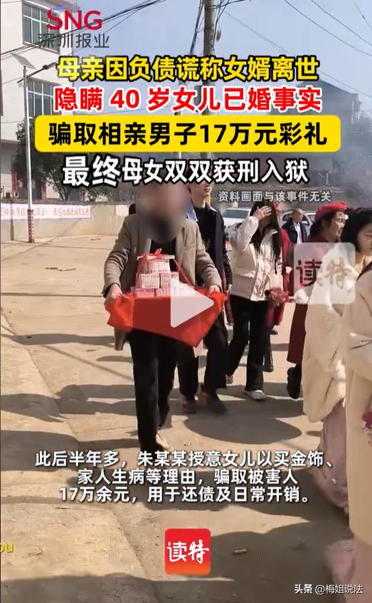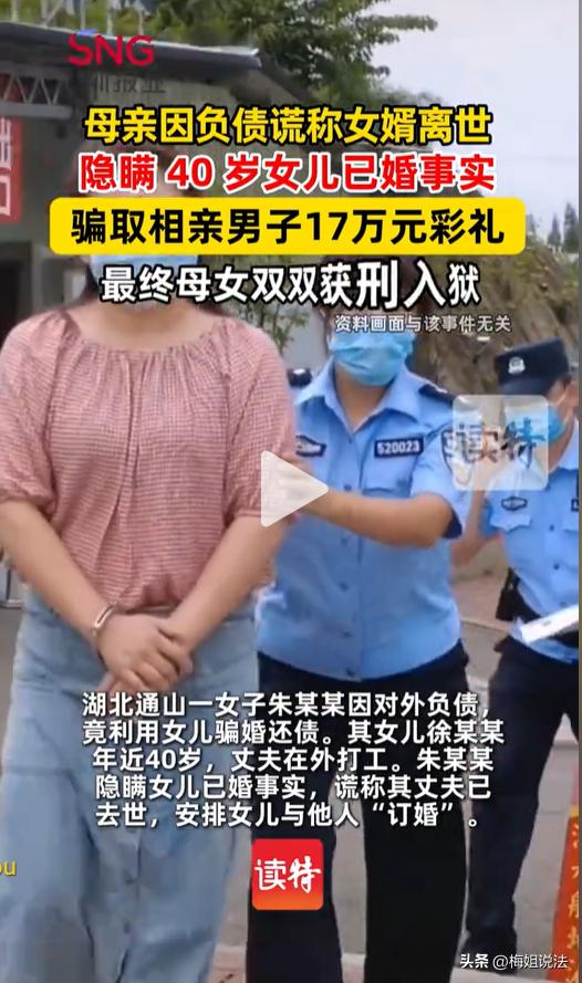 太离谱!湖北一女子因欠高额外债,对外谎称40岁女儿“丧偶单身”,利用女儿去相亲,并以彩礼、生病、急用钱等借口,频繁从相亲对象处要钱,累计高达17万元。真相曝光后,最吃亏、最后悔的的不是被骗的相亲对象,而是她。 朱某是湖北人,2024年期间欠下了巨额外债,还债压力压得她喘不过气来。 为了筹钱还债,她动起了女儿的歪心思,村里还有一些高龄男人在找相亲对象,可以利用40岁的女儿去相亲,赚取彩礼。 朱某一不做二不休,立马找到女儿徐某商量此事。 起初徐某是死活不愿意,丈夫虽然常年在外打工,但自己仍然处于婚姻存续状态,重婚是违法的,这点道理她还懂得。 朱某不放弃,每天不停地给女儿讲大道理,表明自己的处境有多么困难,如果债务还不上,很可能会被起诉,到时候麻烦就大了。 也许是耐不住亲妈的劝说,也许是心疼亲妈的处境,徐某最后答应了。 于是朱某母女俩从此便对外称,女儿的丈夫已离世,目前是单身,反正天高皇帝远,大家也不可能仔细去查。 很快,村里的媒人就给徐某介绍了一个相亲对象,两人见过几次面,觉得很聊得来,不久便开始谈婚论嫁。 朱某率先开口,要求男方要先支付彩礼金,办订婚酒,并且在接下来的半年时间里,朱某怂恿徐某以各种理由向男方家索要钱款,累计高达17万元。 单纯的男方还以为自己遇到了命中的姻缘,毫无防备心理,把钱一次又一次地交出去给朱某母女俩。 直到2025年1月,男方想要和徐某领证结婚,多次催促母女俩,但都被她们以各种理由拖延。 这下男方突然反应过来,可能遇上了婚骗,于是要求徐某把之前支付的彩礼和借款全部退回来。 不料,这对母女收到信息后,果断地把男方拉黑,再也联系不上了。 男方及时地报了警。 在民警的追查下,发现徐某的丈夫并非离世,只是常年在外打工,未回家。朱某母女俩编造单身谎言,假借相亲名义,骗取高额钱款,已经涉嫌刑事诈骗罪。 根据《刑法》第二百六十六条:诈骗公私财物,数额较大的,处三年以下有期徒刑、拘役或者管制,并处或者单处罚金;数额巨大或者有其他严重情节的,处三年以上十年以下有期徒刑,并处罚金;数额特别巨大或者有其他特别严重情节的,处十年以上有期徒刑或者无期徒刑,并处罚金或者没收财产。本法另有规定的,依照规定。 诈骗公私财物价值三千元至一万元以上、三万元至十万元以上、五十万元以上的,应当分别认定为刑法第二百六十六条规定的 “数额较大”“数额巨大”“数额特别巨大”。 朱某母女俩累计骗取17万元,属于数额巨大的范畴,母亲朱某被判罚3 年 6 个月,女儿徐某被判罚1 年 10 个月。 其实在此次案件中,受害最大的并非是男方,而是40岁的徐某。 因为听信母亲的谗言,主动配合骗婚,明明可以和丈夫过上普普通通的夫妻生活,现在却因为自己的一时贪念,亲手毁掉了原本和睦的家庭。 更可悲的是,骗取的钱款大都被母亲拿去还债,自己分不到几两,却要背上一辈子的骂名和案底。 以后徐某在家人、孩子、外人面前,还怎么做人。 为了这17万,她牢要坐,骂名要背,婚要离,家要散,所有的压力都压她一人身上。 话说回来,这起案件再次给所有相亲人事提了个醒,遇到有眼缘的相亲对象,千万别被一时情深迷了双眼,到了谈婚论嫁的地步,对方的身份证、户口本,婚姻状况还是要一一核查。 彩礼和礼金,尽量采用转账的方式,加上备注给对方,尽量避免现金等没有依据的方式给予。 对于一开口就索要十几万的相亲对象,一定要警惕,发现被骗及时报警立案。 相亲市场太多浑水摸鱼的现象,大家一定要擦亮双眼。 对于此事,你怎么看?