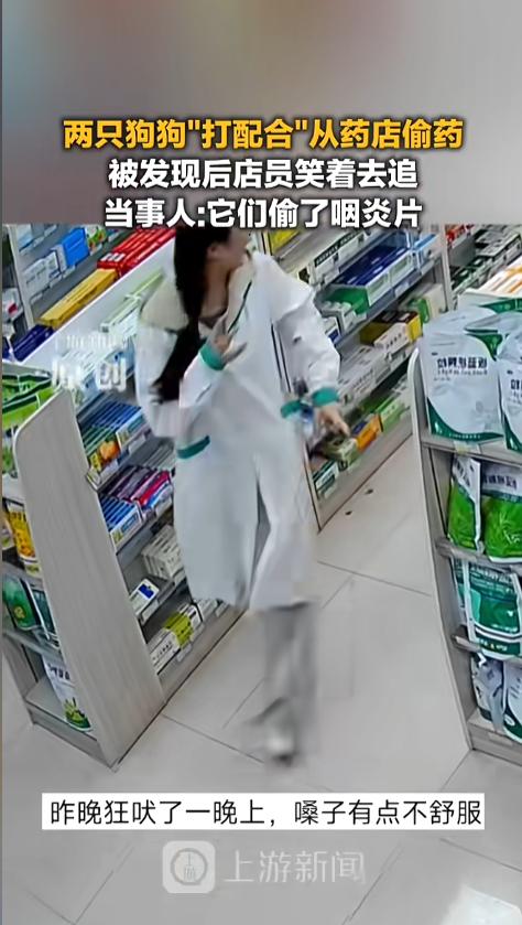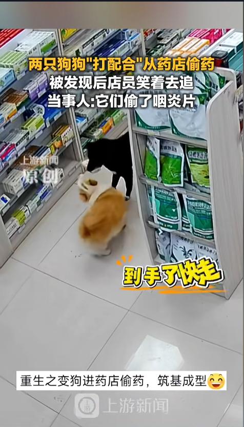 “狗子成精了?”近日,湖南,一家药店内,店员正在里面忙碌,两只狗狗从外面溜了进来。柯基在一旁望风,另一只黑狗跑到药架旁,从最低下叼起一盒药就跑。还好店员及时发现,追了出去,最后在旁边的超市狗赃并获!网友:偷的什么药啊? 见过人偷药的,但很少见人偷药的,狗偷药更是闻所未闻,若不是有监控为证,简直让人难以相信。 据媒体3月28日报道,偷药的是一只小黑狗,名叫踏雪,是只小母狗。旁边还有只柯基陪着,名叫豆包,是小公狗。这只柯基是店员养的,上面的时候就放在药店外面,平时不让进来。 这一天,两只狗鬼鬼祟祟跑了进来,柯基在一旁望风,看着店员的动向,黑狗则直接跑到了药架跟前,从最底下那层叼起一盒咽炎片就跑,前后只有不到一分钟的时间。动作之迅速,仿佛演练过多少遍似的。 虽然两只狗动作很快,但还是被店员发现了。一位店员喊着“狗怎么偷药了?”追了出去,自己都被两只狗给逗笑了。另一位店员闻声也追了出去。很快,在旁边的超市那儿,将两只狗抓获。狗赃并获,铁证如山。 网友看后表示,这是平时叫的太多,嗓子不舒服,拿盒咽炎片给自己缓解缓解么?以前只听说狗狗会自己出去找草药,没想到会到药店了找呢!不过两位店员以后可得盯紧点,小心被扣工资! 信息来源:《3月28日(采访),湖南,