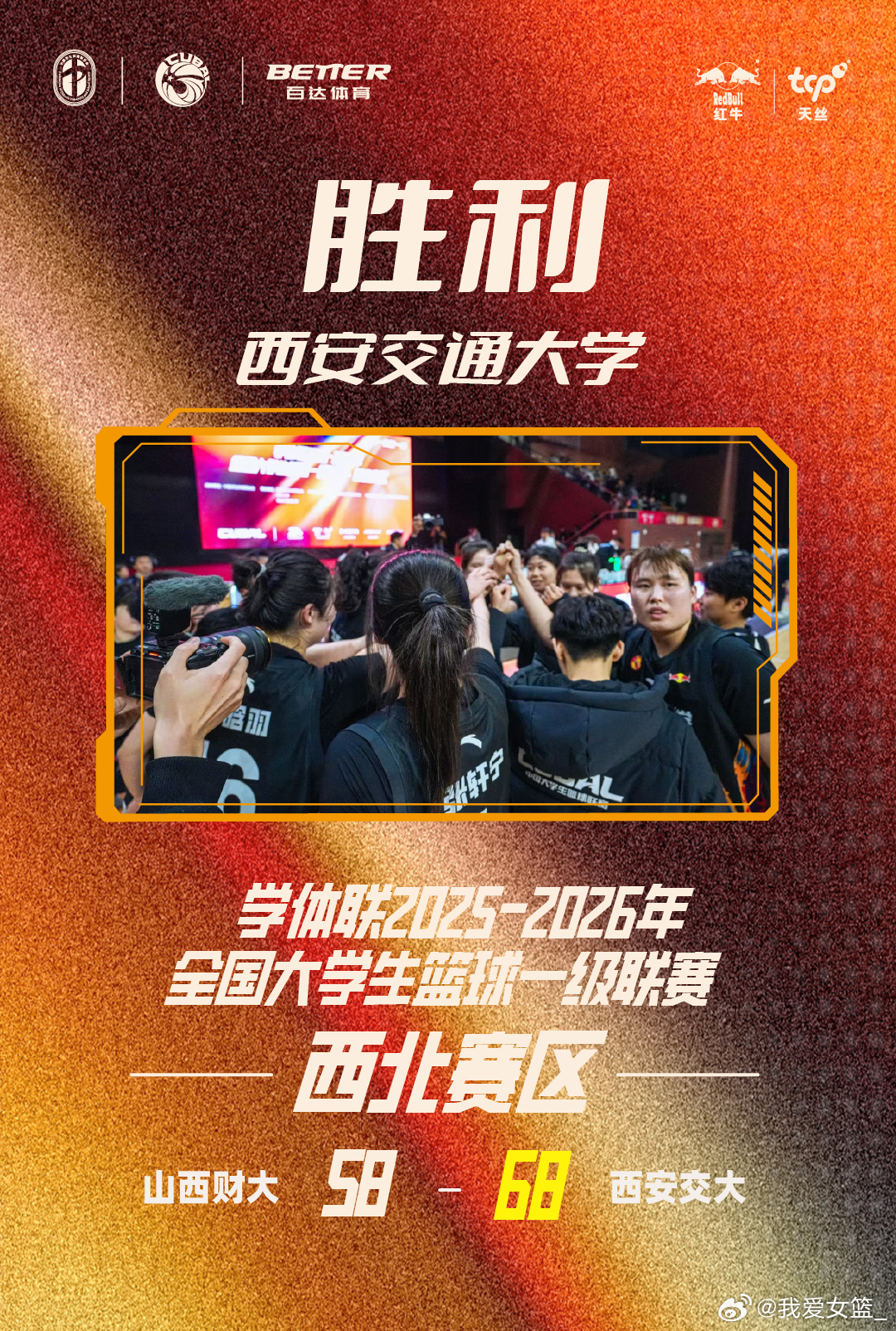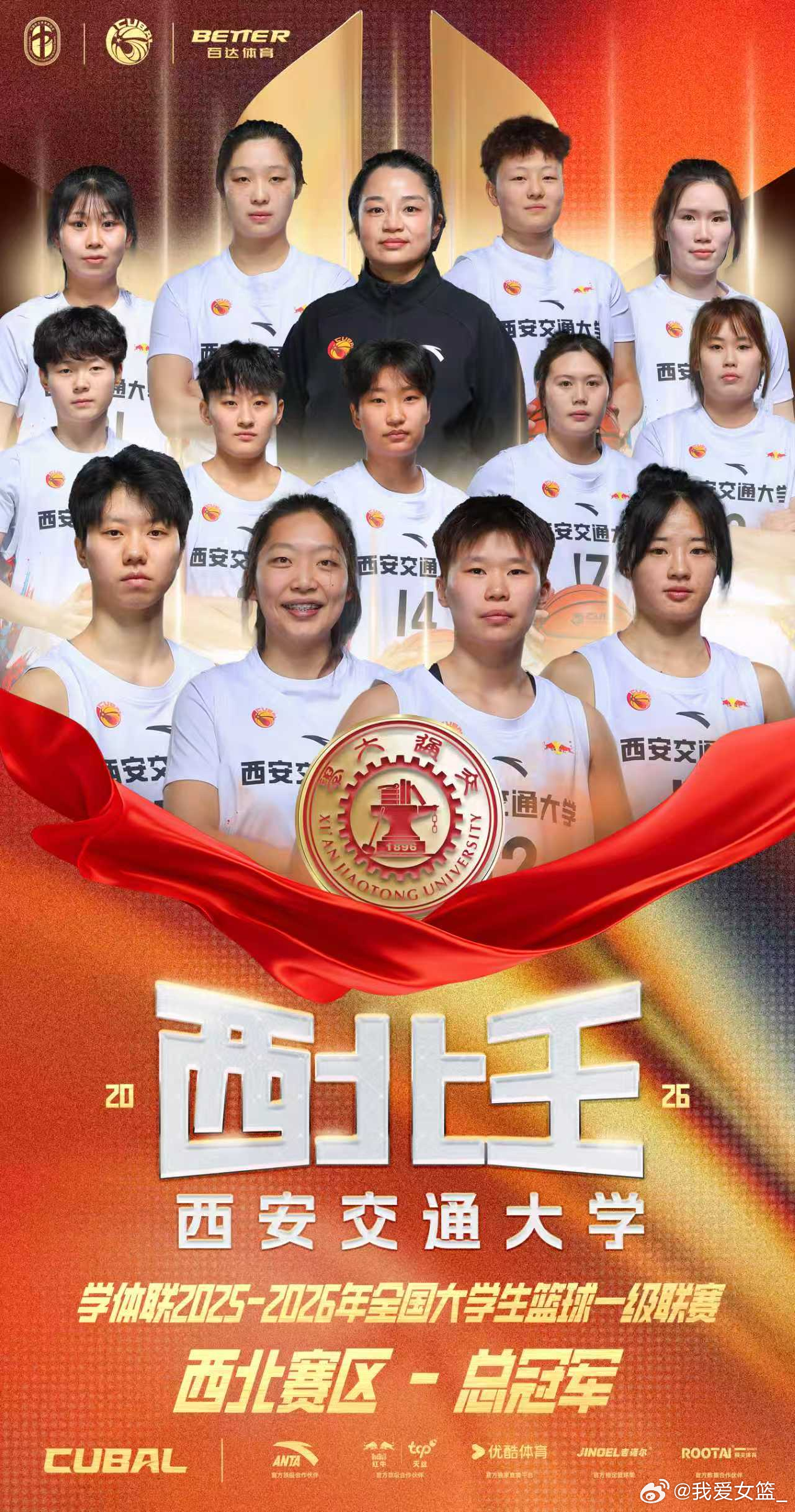 【西北赛区尘埃落定 西安交大女篮蝉联西北王】在昨晚进行的CUBAL西北赛区女子组决赛中,西安交通大学以68-58战胜山西财经大学,强势蝉联西北王,这是西安交通大学女篮第五个西北赛区冠军。山西财大、河南大学女篮分别斩获亚军和季军。CUBAL 回顾西安较大女篮的夺冠历程,她们在小组赛阶段均大比分取胜,以小组头名身份出线。1/8决赛西安交大以61分的优势战胜山西大学强势晋级;1/4决赛再次大胜郑州大学晋级四强;半决赛面对河南大学,交大女篮全场领先轻松取胜;决赛阶段,她们虽在第一节就取得两位数优势,但山西财大凭借顽强意志数次将分差缩小至一个球权内,最后时刻韩晴的三分球一锤定音,杀死比赛悬念,西安交大女篮再次卫冕。 数据方面:西安交大全队4人得分上双,韩晴以17分4篮板5助攻的全面表现当选MVP,郭晓妮11分5篮板5助攻,张轩宁11分8篮板,赵晗羽10分6篮板。山西财大孙晓涵13分,薛雅琪10分5篮板,侯蕊婕9分19篮板6助攻。