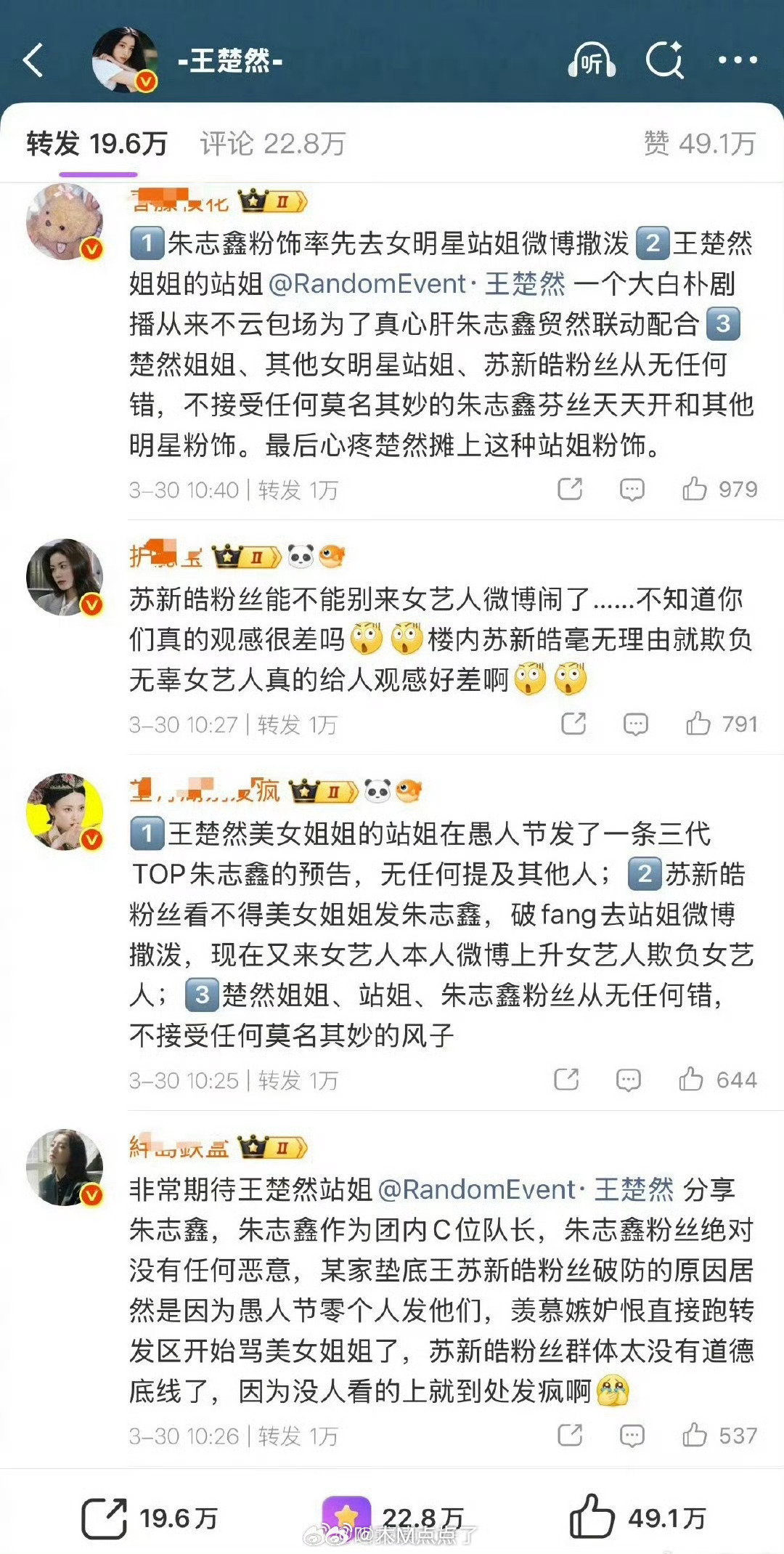 愚人节站姐团建打响第一炮王楚然粉跟苏新皓粉咋啦 看到是王楚然站姐预告了要发朱志鑫,王楚然微博转发区已被朱志鑫苏新皓两家占了 被苏新皓粉丝疯狂质疑,两家在王楚然的商务博下面吵了快20万轮转了。王楚然转发区
