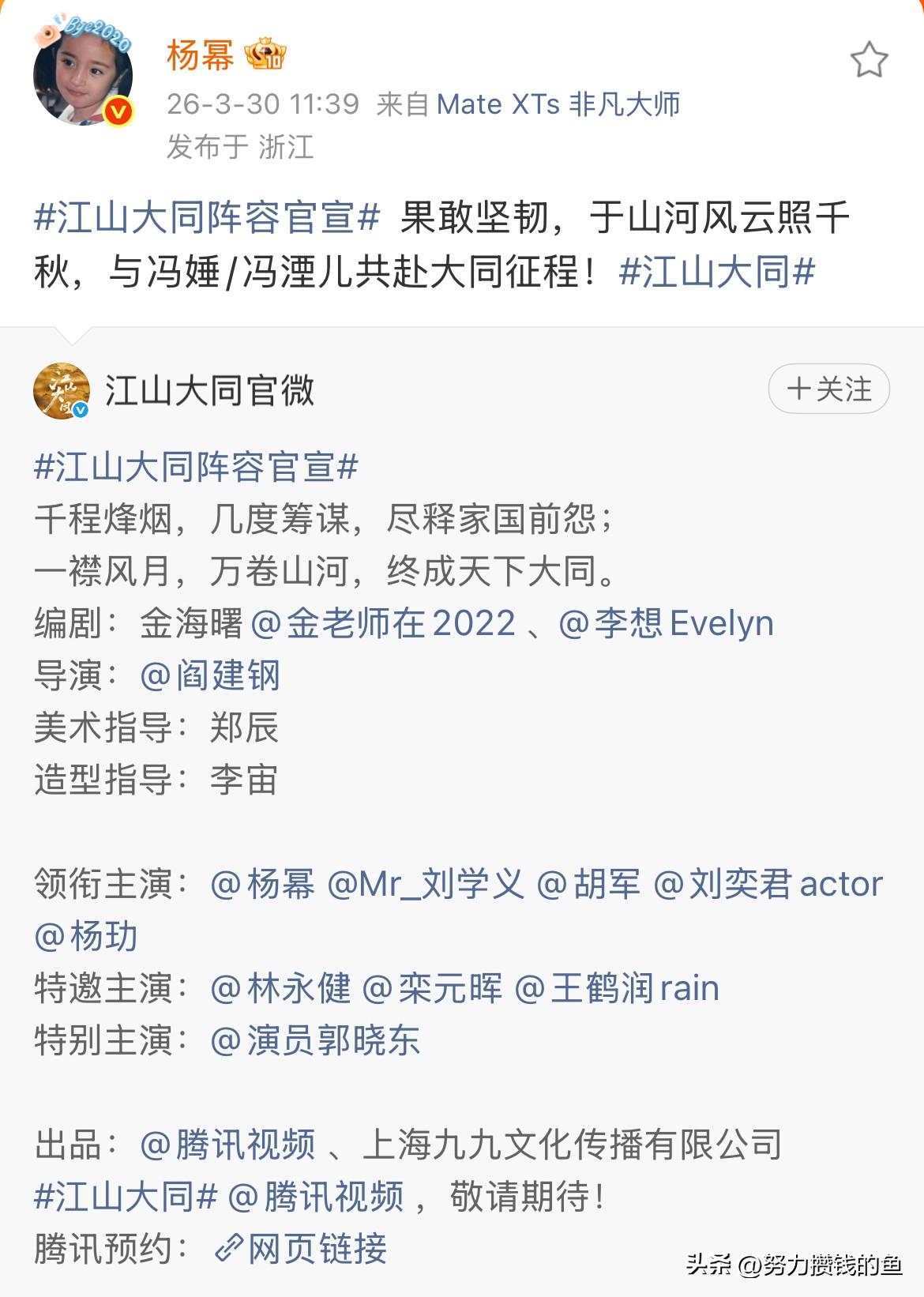 杨幂,更新最新动态; 3月30日,杨幂更新了最新动态,不过这次不是自己的美照,而是官宣了新作品; 杨幂说:果敢坚韧,于山河风云照千秋,与冯娷/冯湮儿共赴大同征程! 杨幂在剧中饰演冯太后,年龄跨度数十年,从少女到太后,看来是对杨幂演技的考验,也让人狠狠期待; 网友们看到后,纷纷留言: 期待值拉满 要从少女演到太后,这种角色太适合她来挑战了 这种年龄跨度的大女主戏,谁能不期待。