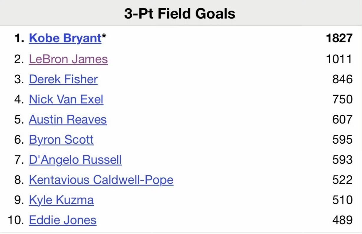 湖人队史三分球命中榜,未来东契奇能进来! 科比1827个是湖人队史第一。 詹姆斯1011个排在第二,最多1200个吧。 东契奇才来湖人不到一年,要是能打十年,超越费舍尔前三名,对吧,[大金牙]