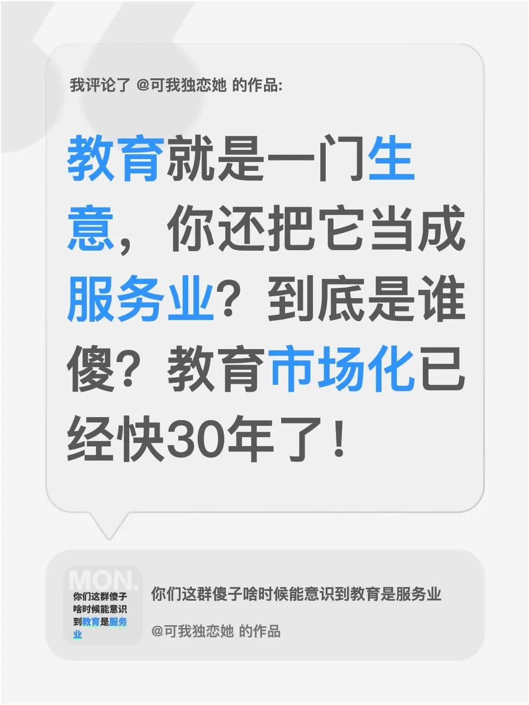 我评论了@可我独恋她 的作品:教育就是一门生意,你还把它当成服务业?到底是谁傻?教育市场化已经快30年了!