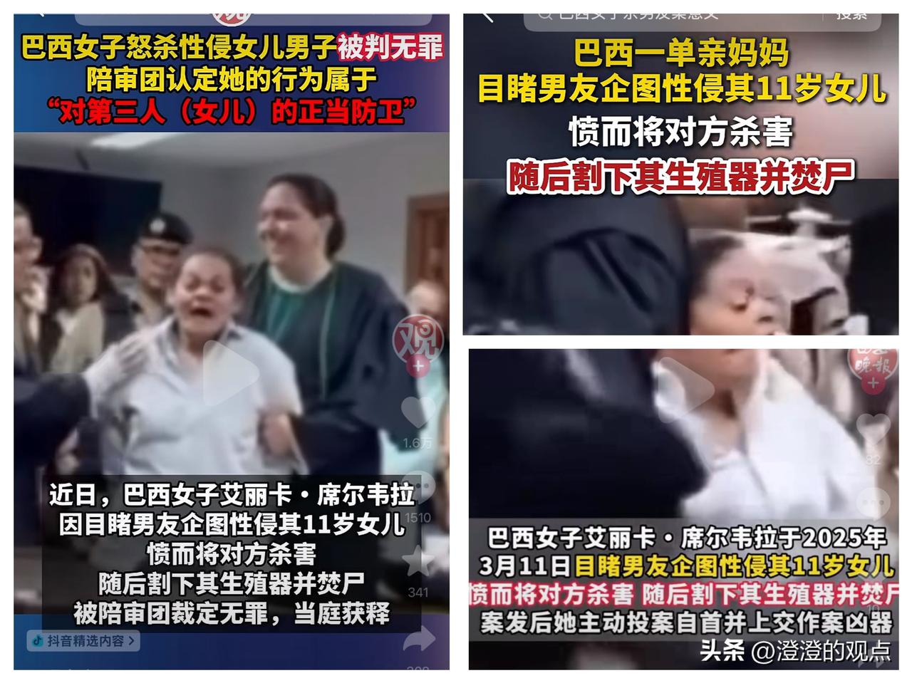 巴西母亲为救女痛下杀手, 毁尸灭迹却被判无罪,争议炸锅! 把人活活打死,割了要害,连夜把尸体烧了。 42岁单亲妈妈艾丽卡,半夜听见11岁闺女惨叫。 推门一看,同居男友正压在孩子身上图谋不轨。 我觉得换作任何一个当妈的,当时脑子都得炸。 她硬生生把这男的拖出房间,又是刀捅又是棍砸。 “直接切断命根子一把火烧了尸体”。 天一亮,人家就拎着凶器去自首了。 巴西陪审团也是干脆。 仅用一天全票通过,认定正当防卫直接放人。 不少女网友拍手称快,说这就是护崽的本能。 也有人嘀咕,这事要是搁在咱们这,估计有的扯了。 毕竟致死后还割器官毁尸。 法理上大概率逃不掉防卫过当的帽子。 面对侵害自己幼女的恶魔,任何一位母亲都会爆发出不顾一切的本能。 这位单亲妈妈的行为虽极端,却是绝境里最绝望的反抗,本质是拼尽全力守护孩子。 法律该严惩施暴者,更该体谅为人父母在极端恐惧下的本能反应,这不是残忍,是正义的自保。 网友: 正义的律师,正义的陪审团,正义的法官,正义的判决!法外柔情,人间大爱,希这种法律之光,照耀中华大地! 一边是禽兽对幼女的恶行,一边是母亲拼尽全力的反击。 当恶魔突破底线,母亲的疯狂就是最硬的铠甲。 这样的判决,你觉得大快人心吗?